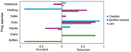 Fig. 1: Prey species avoided and selected for by lions, spotted hyaenas and cheetah in Liwonde National Park (figure adapted from the original publication).[