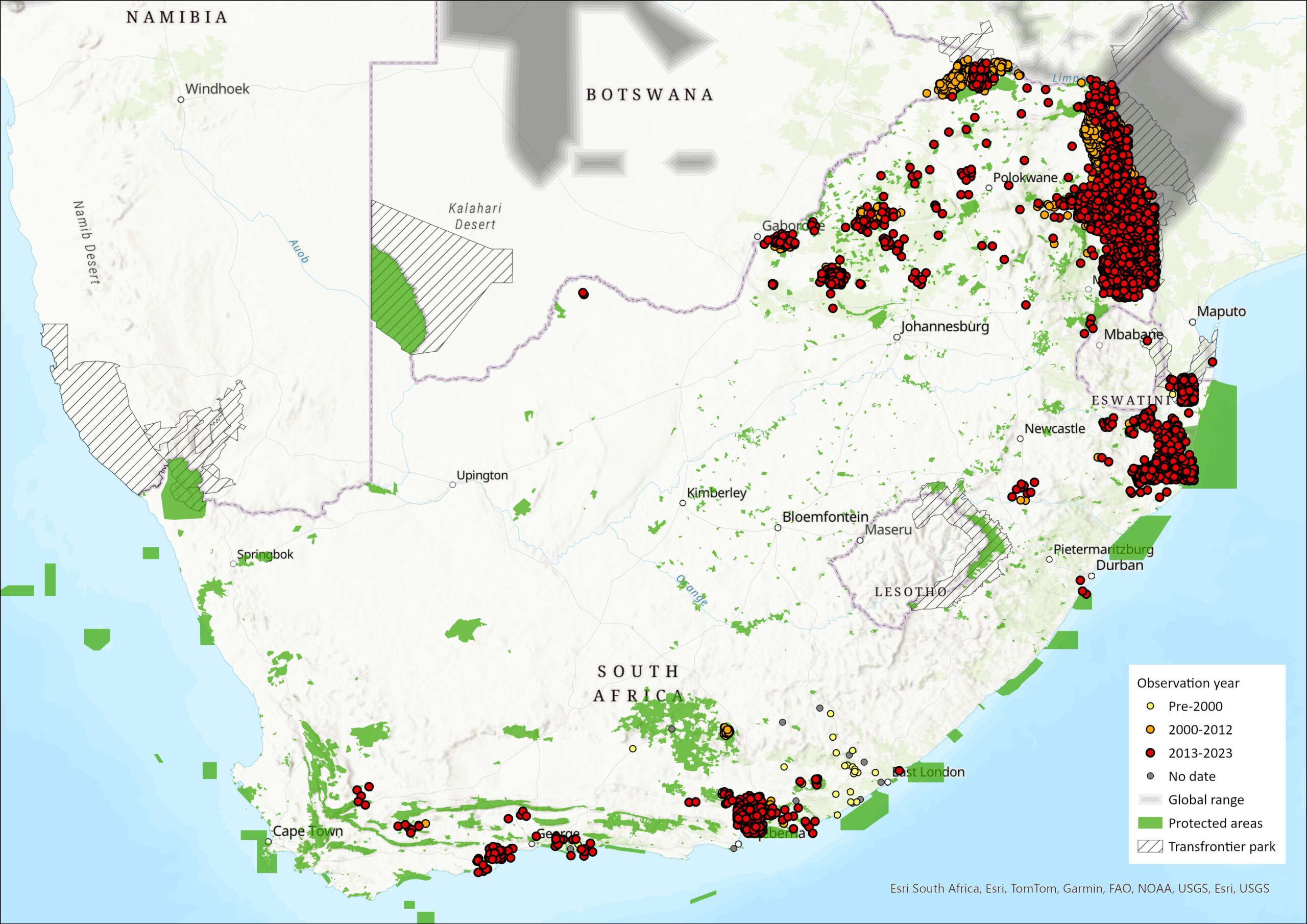 Figure 1. Distribution records for African Savanna Elephant (Loxodonta africana) within the assessment region (South Africa, Eswatini and Lesotho). Note that distribution data is obtained from multiple sources and records have not all been individually verified.