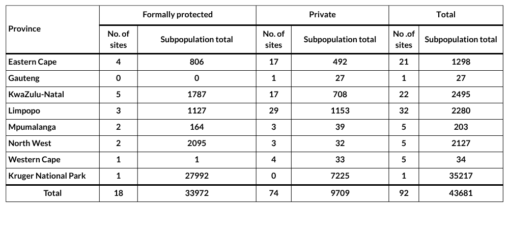 The total national wild population is estimated at approximately 43,681 elephants of which 33,972 elephants occur on state-owned land, and 9,709 elephants on privately or communal owned land (Table 1)(SANBI, 2024) of which 16,599 are estimated to be mature based on a 38% mature herd structure (Owen-Smith 1988). The largest subpopulation currently is that of KNP (30,176 animals) (end of 2024) (Ferreira et al. 2024) and the adjoining agglomeration of reserves to the west of the KNP (7,225 animals) with a total population estimate of 37,401 elephants (14,212 mature individuals). Currently, approximately 73% of the properties in South Africa have fewer than 100 elephants (SANBI, 2024), occurring on small and medium-sized fenced properties which are managed to prevent habitat degradation (Slotow et al. 2005; Cook et al. 2023; Delsink et al. 2023). Metapopulation management is not implemented among small and medium-sized reserves, but is important for retaining the genetic diversity within the national population. Metapopulation guidelines for the management of elephants in South Africa is currently being developed. Note that metapopulation dynamics are ecological processes and not a genetic construct. Metapopulation dynamics, however, will result in robust genetic outcomes across the metapopulation.