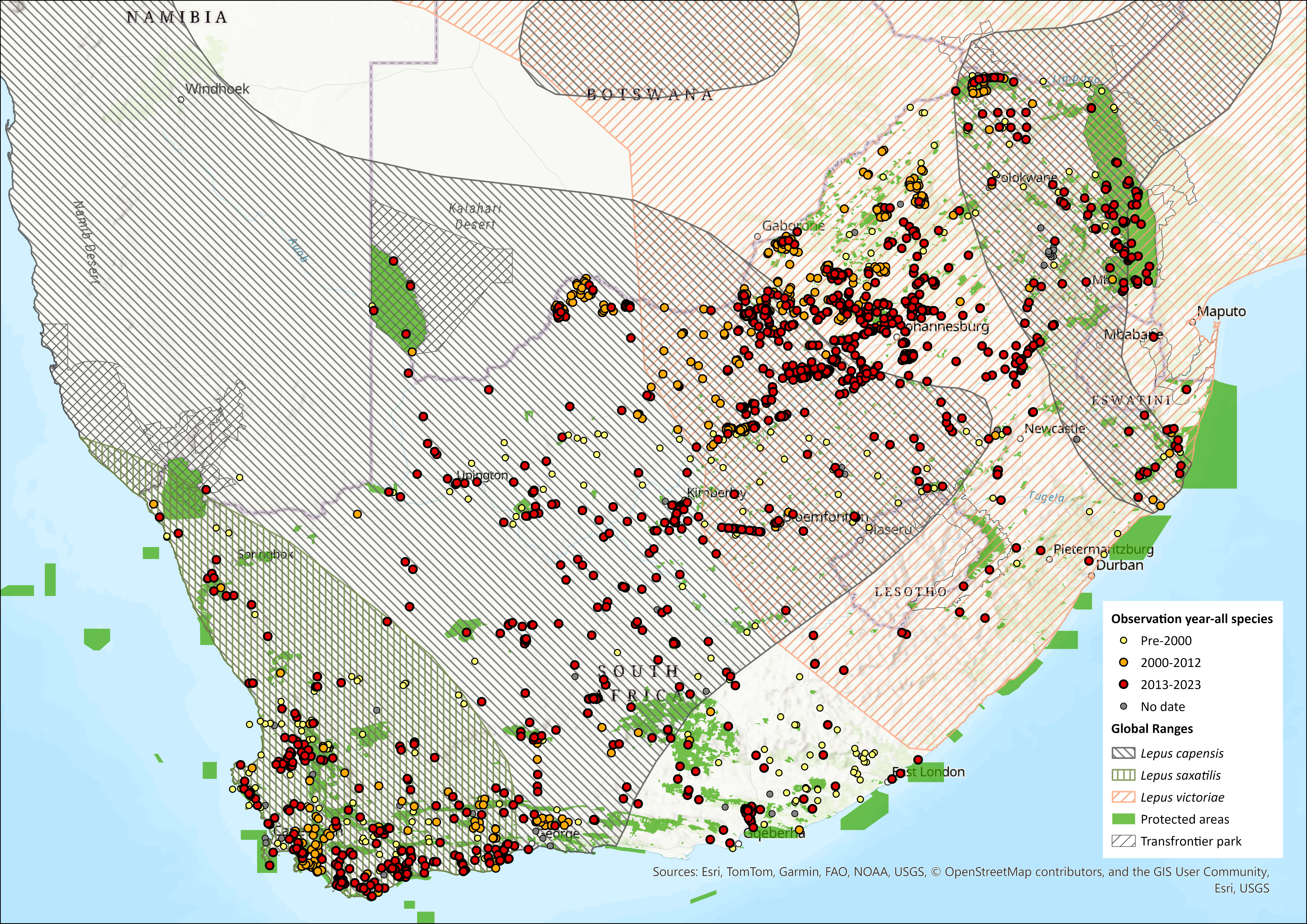 Figure 1. Distribution records for African Savanna Hare (Lepus victoriae) within the assessment region (South Africa, Eswatini and Lesotho). Note that distribution data is obtained from multiple sources and records have not all been individually verified.