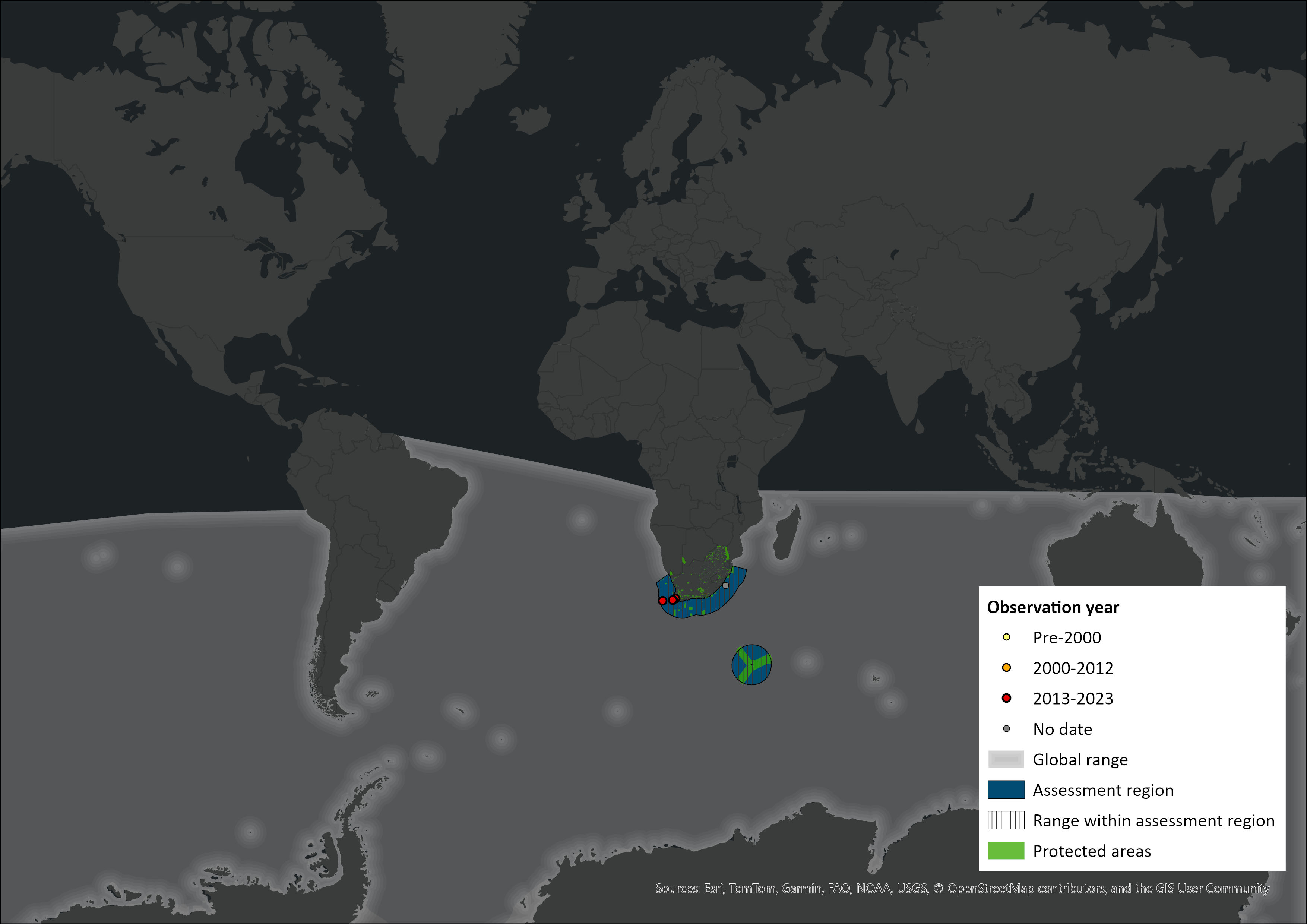 Figure 1. Distribution records for Antarctic Minke Whale (Balaenoptera bonaerensis) within the assessment region (South Africa, Eswatini and Lesotho). Note that distribution data is obtained from multiple sources and records have not all been individually verified.