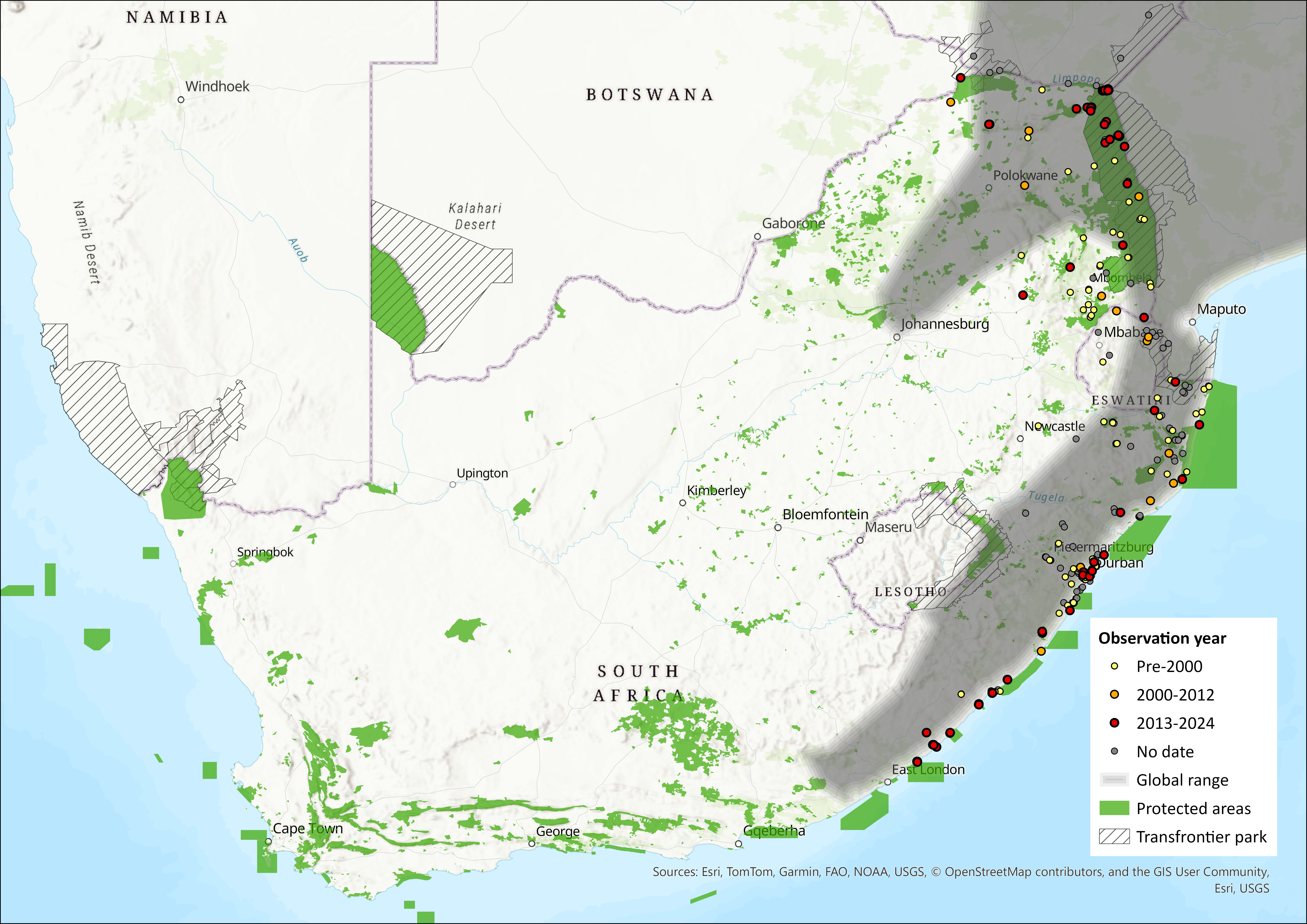 Figure 1. Distribution records for Banana Bat (Afronycteris nanus) within the assessment region (South Africa, Eswatini and Lesotho). Note that distribution data is obtained from multiple sources and records have not all been individually verified.