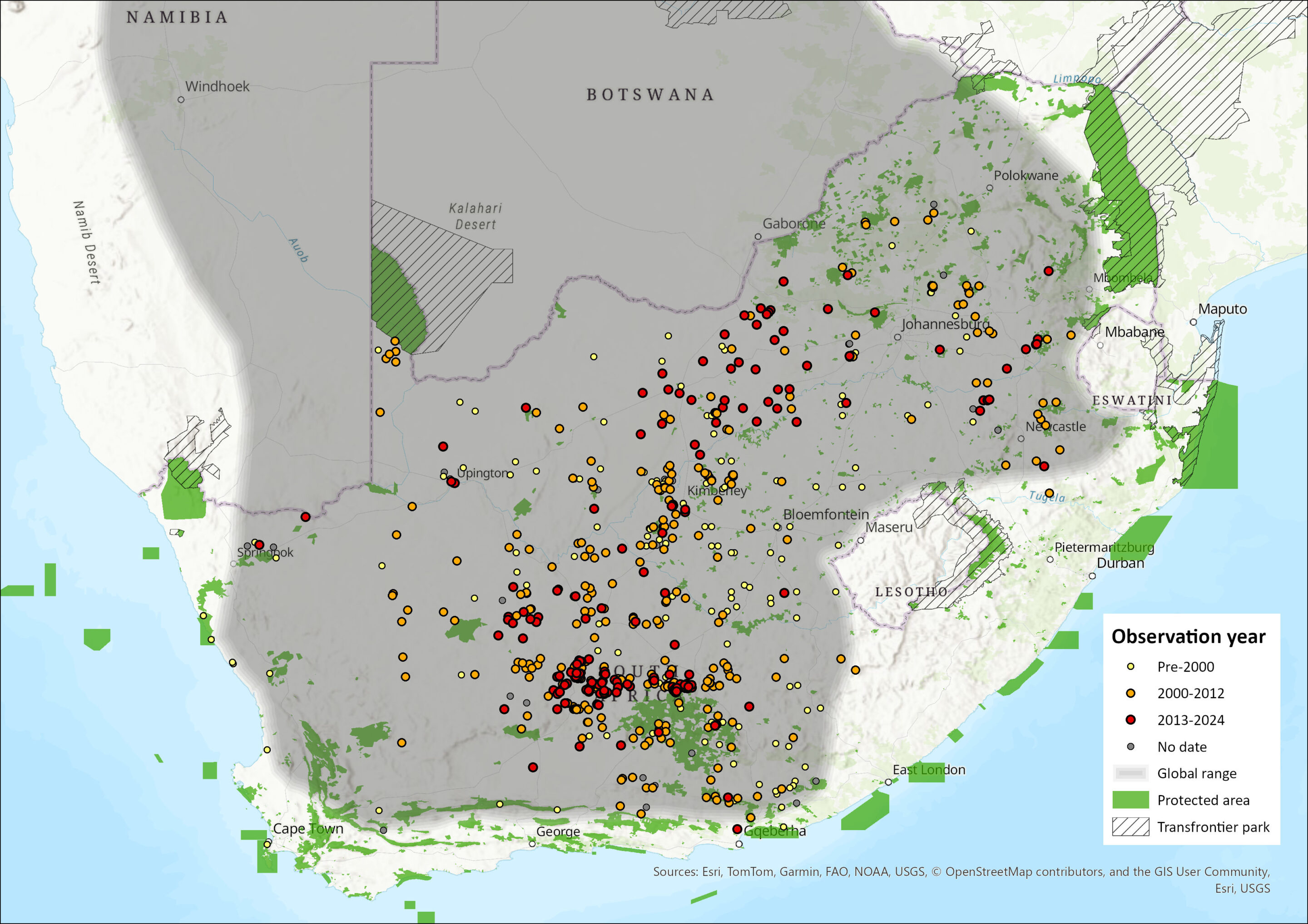Black-footed Cats have the most restricted distribution of any of the African felid species (Nowell & Jackson 1996; Wilson 2016). The species is endemic to the arid grasslands, dwarf shrub, and savannah of the Karoo and Kalahari in southern Africa (Sliwa 2013; Wilson 2016), and in the Southwest Arid zone (Skinner & Chimimba 2005). Most of the range occurs within the boundaries of South Africa, thinning out northwards into Botswana, Namibia and marginally in Zimbabwe and likely marginally in extreme southern Angola (Sliwa 2013; Wilson 2015). They have been known from earlier baselines to inhabit most of South Africa’s arid interior (Stuart 1982; Skinner & Chimimba 2005), including northern parts of the Western Cape (Skead 2011), northern parts of the Eastern Cape (Von Richter 1972; Stuart 1981; Lynch 1989), Northern Cape (Skead 2011; Stuart 1981), Free State (Von Richter 1972; Lynch 1983), North West (Von Richter 1972; Rautenbach 1982), KwaZulu-Natal (Rowe-Rowe 1992), and marginally so, in Gauteng (Rautenbach 1982), Mpumalanga (Rautenbach 1982), and in Limpopo (Power 2000). The occurrence of the species in Eswatini (M. Reilly pers. comm. 2024, and A. Monadjem pers. comm. 2014) and Lesotho (N. Avenant pers. comm. 2024) is considered highly unlikely, and no records exist to date.