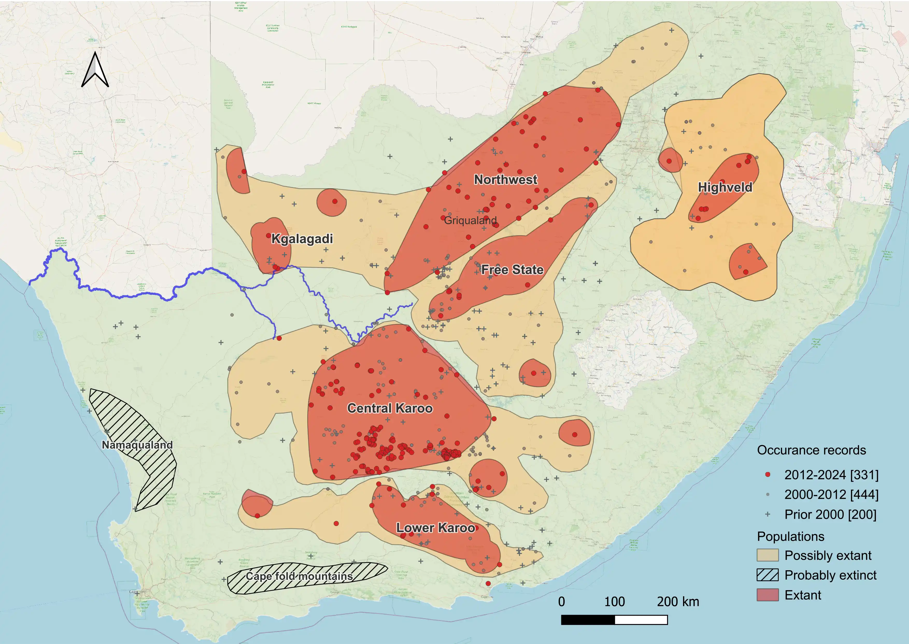 The largest extant population occurs in the Nama Karoo region in central South Africa (~73,500 km²). The region has relatively contiguous habitat with low human and livestock population densities, however populations may be highly variable due to low rainfall and extended periods of draught exacerbated by widespread persecution of predators, including poison (Nattrass & Conradie 2018). Densities likely decrease westerly with lower rainfall and the absence of Springhare (Pedetes capensis) and Ground Squirrel (Geosciurus inauris) populations, with Black-footed Cat dependent on these fossorial species for access to burrows (Brindley et al. 2024). The Karoo is divided laterally by the escarpment of the Greater Karoo plateau where the Baviaans Kloof pass likely restricts genetic exchange. The lower Karoo region south of this plateau has a narrow lateral band of records with densities likely decreasing to the west which is more arid and does not support Springhare or Ground Squirrel populations, and to the east with increasing rainfall and thicket vegetation. However, recent camera trap and photographic records confirm the species occurs in suitable pockets of habitat in this region. The southern and western most extent of the species’ distribution in the Western Cape has likely constricted from previous reports. Two specimens collected near the town of Montagu (Stuart 1982), and two sighting records in Namaqualand region prior to the 21st century are likely extinct but are historical outliers (over 250 kms from the nearest extant record) and may not have represented viable populations anyway. Fynbos habitat is characteristically brushy with low prey densities and population persistence may have relied on patches of grassland in the valley regions which have since largely been converted to crop production. No other sightings have been reported in these outlying regions before or since. Perhaps concerningly, no new records have been reported in the Western Cape province since the previous assessment, although populations likely persist considering proximity of bordering Northern and Eastern Cape records.