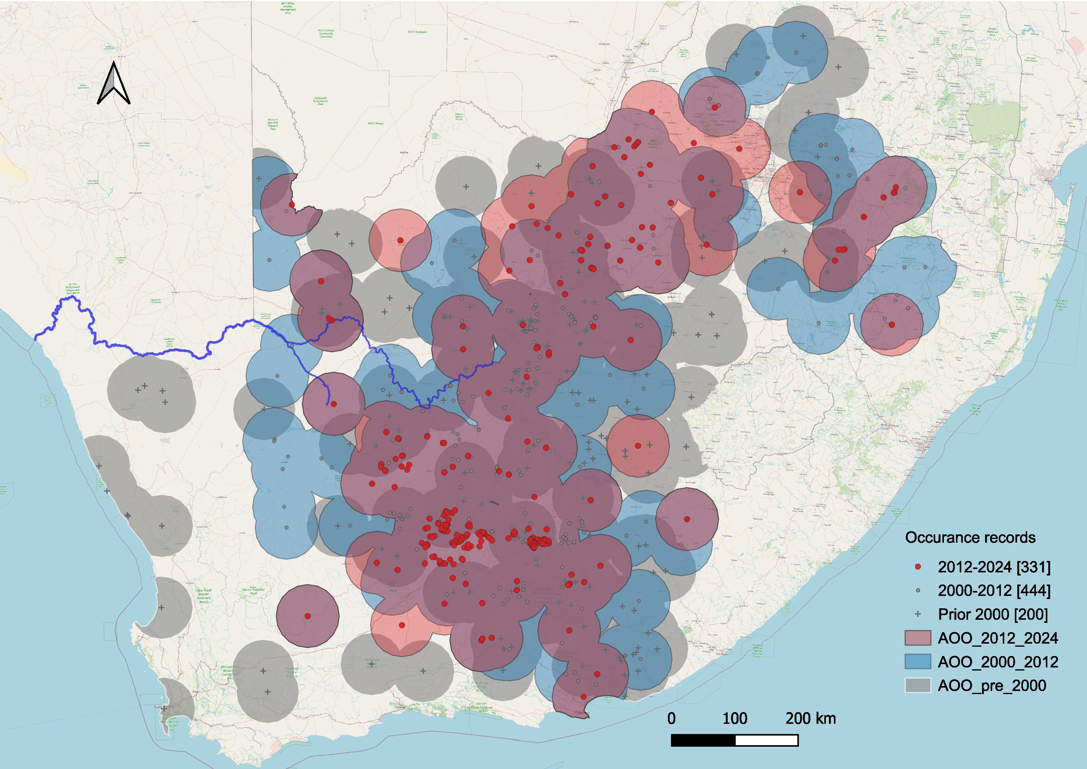 | AOO method | 50 km buffer around occurrence records, dissolved overlaps, clipped to South Africa boundaries; also 2×2 km grid counts following IUCN AOO standards and count of number of occurance records intersecting grid |