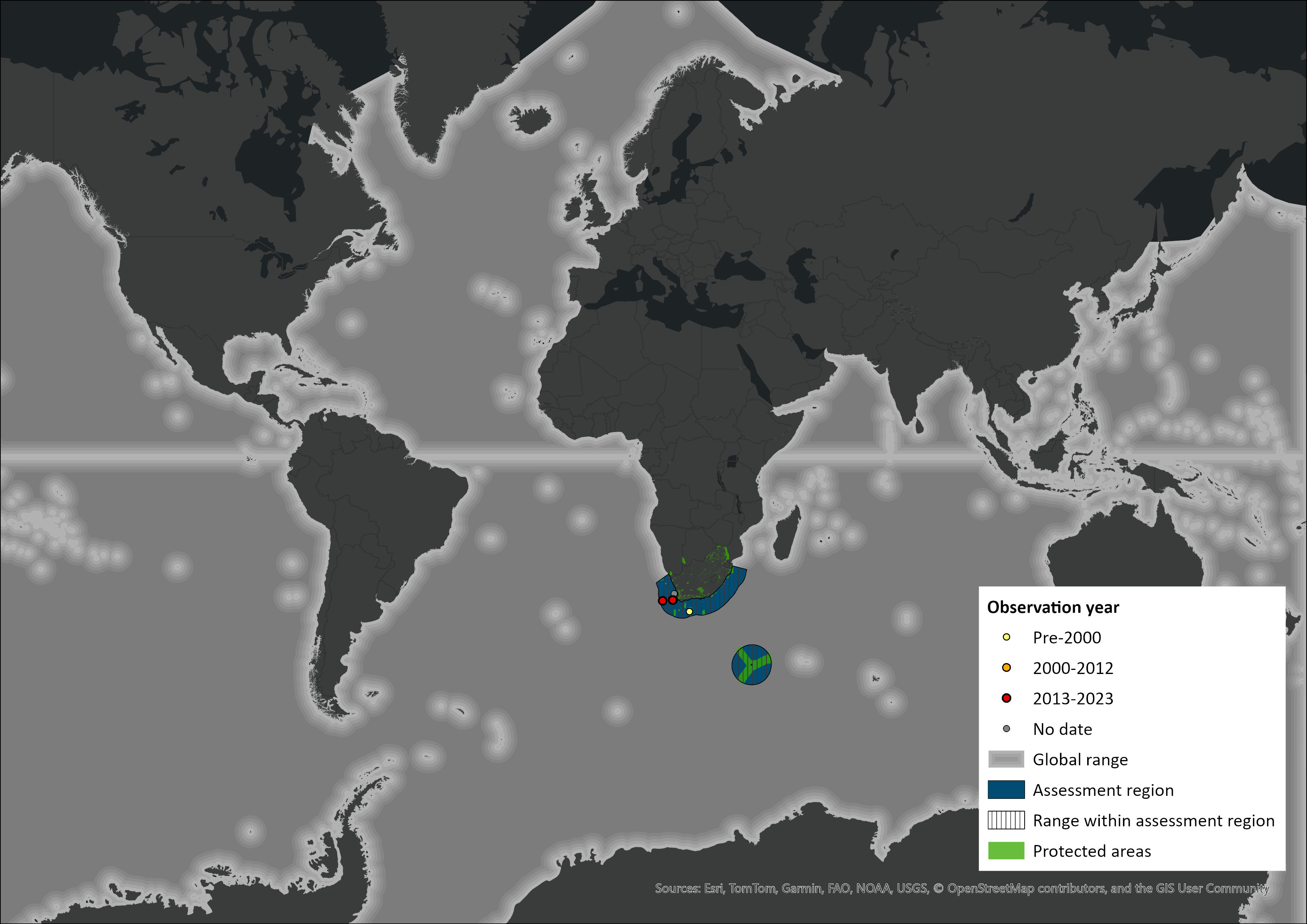 Figure 1: Distribution records for Blue Whale (Balaenoptera musculus) within the assessment region (South Africa, Eswatini and Lesotho). Note that distribution data is obtained from multiple sources and records have not all been individually verified.