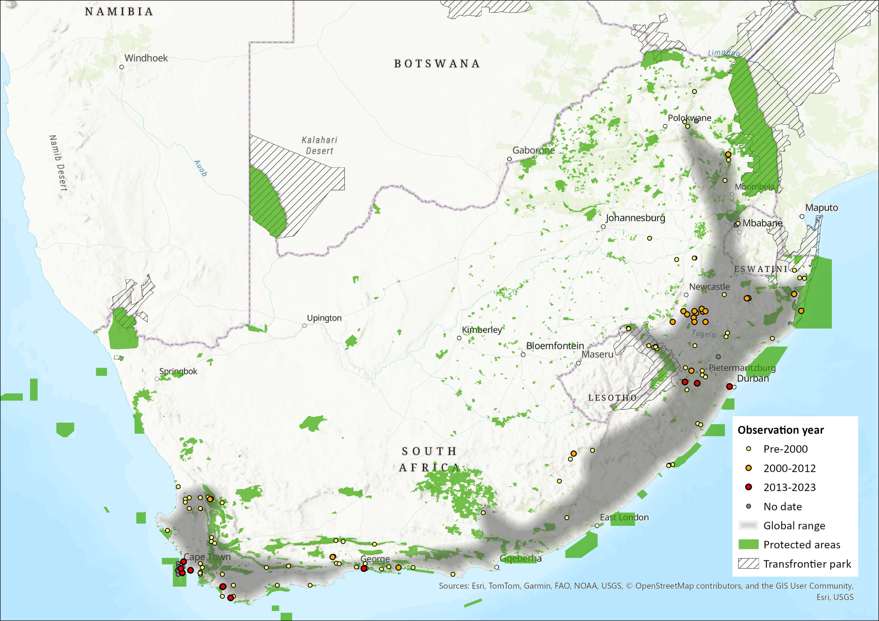 Figure 1. Distribution records for Brant’s Climbing Mouse (Dendromus mesomelas) within the assessment region (South Africa, Eswatini and Lesotho). Note that distribution data is obtained from multiple sources and records have not all been individually verified.