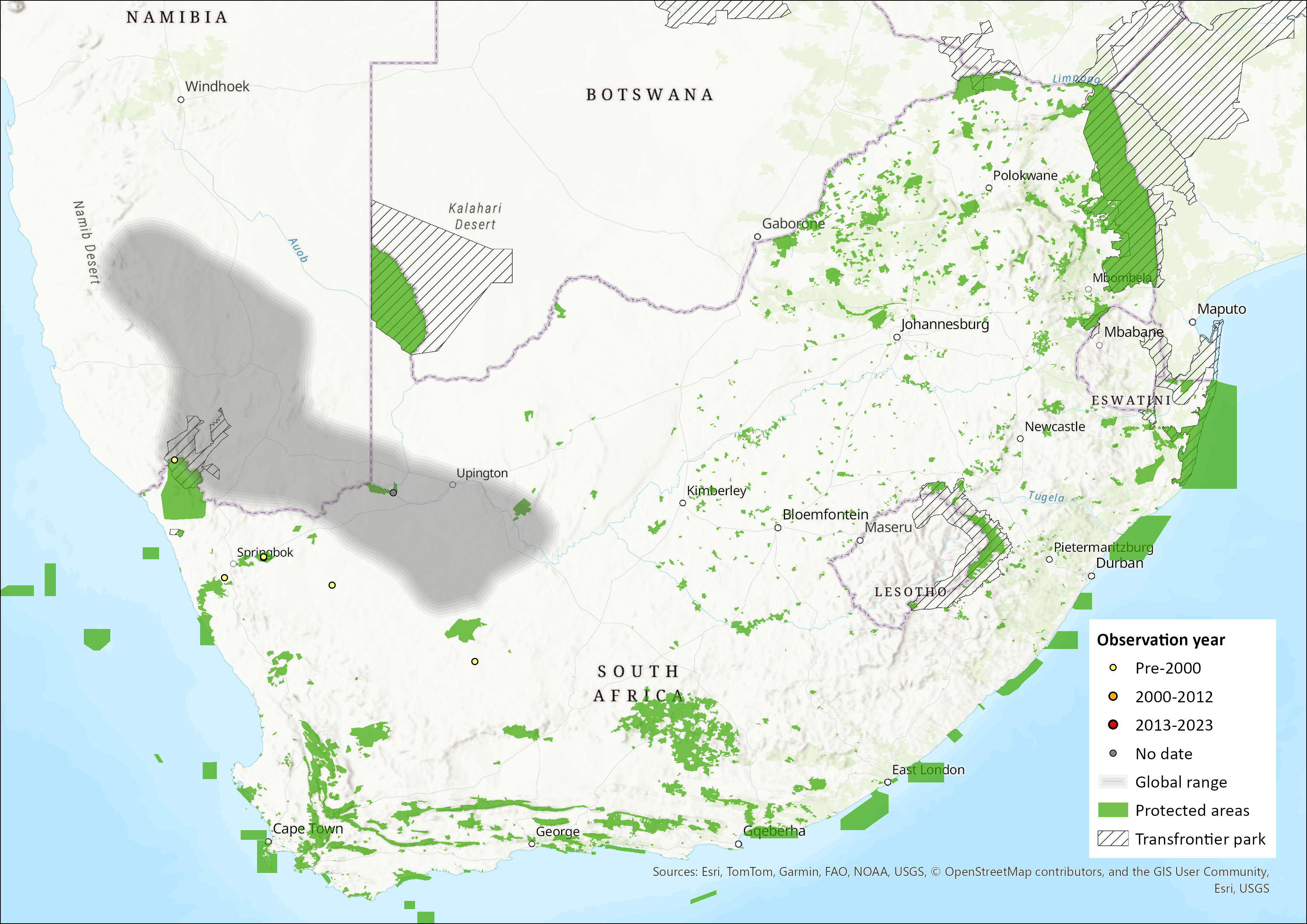 The rapidly expanding construction of renewable (in particular solar) energy projects in the Northern Cape may signify an emerging threat to this species as its range partially overlaps with earmarked areas (van der Westhuizen 2013). Additionally, habitat degradation through overgrazing by domestic sheep and goats may be a threat, particularly during drought periods (Coetzee 2013).