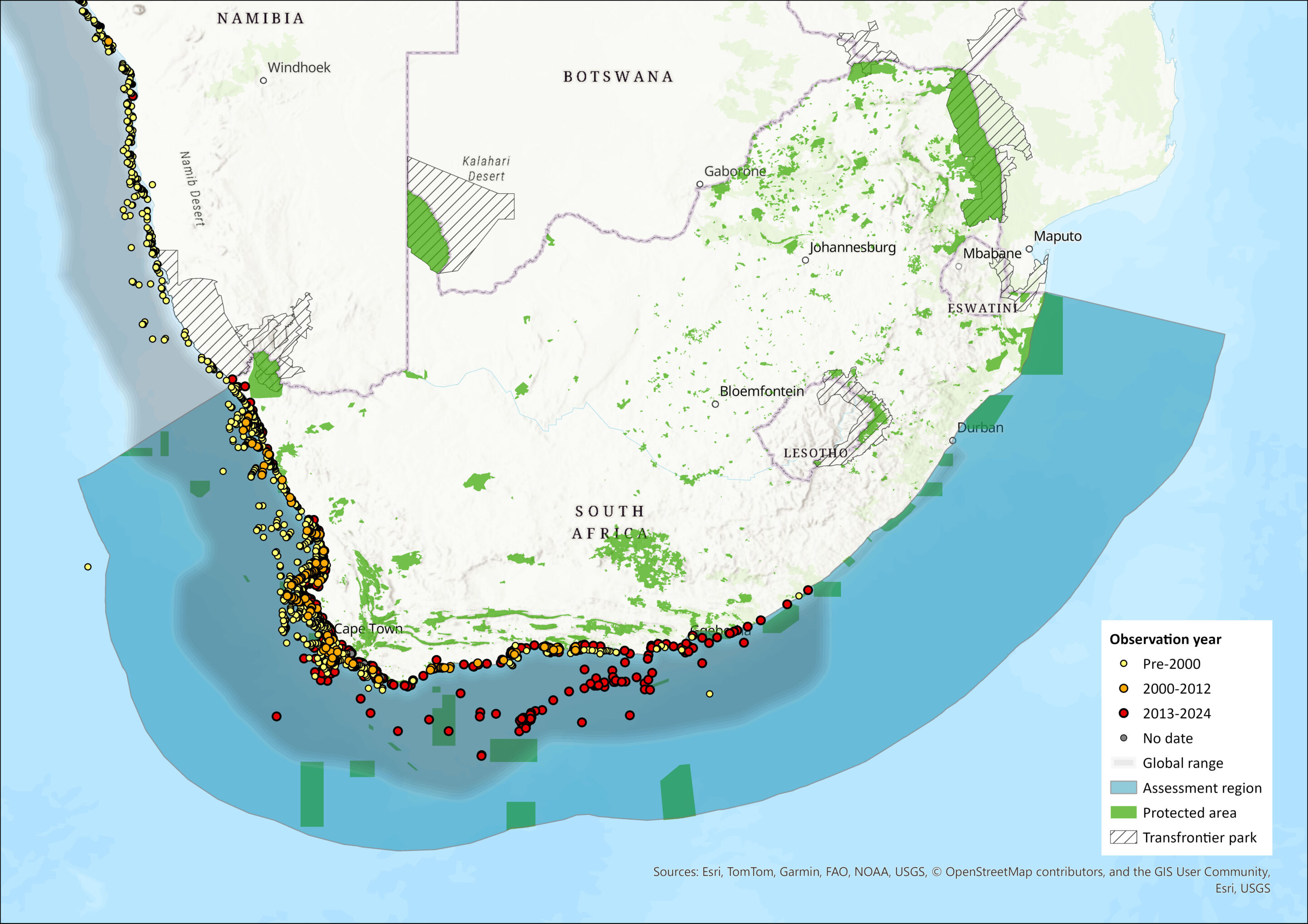 Figure 1. Distribution records for Cape Fur Seal (Arctocephalus pusillus pusillus) within the assessment region (South Africa, Eswatini and Lesotho). Note that distribution data is obtained from multiple sources and records have not all been individually verified.