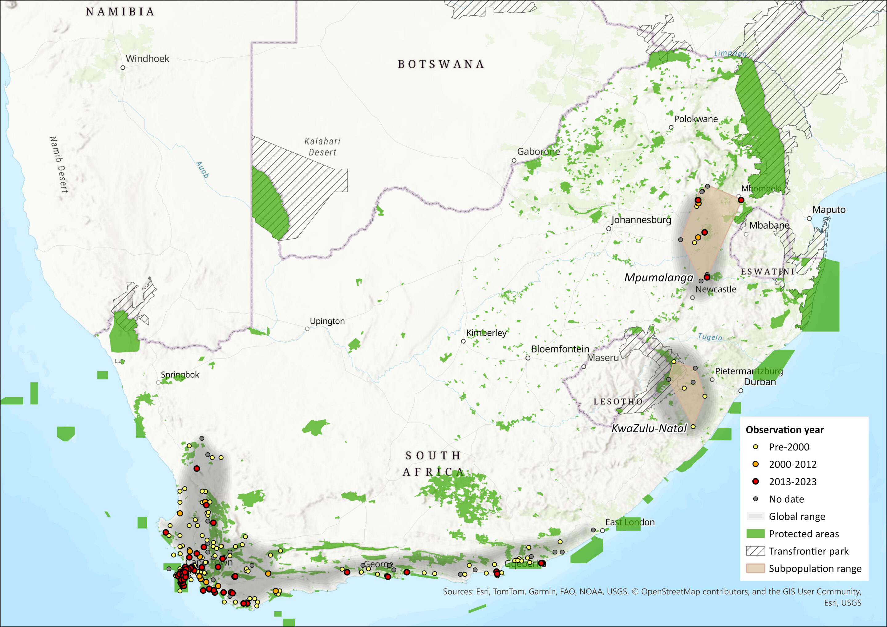 Finally, further studies into the taxonomic status and distributions of the KwaZulu-Natal and Mpumalanga subpopulations are needed. If the subpopulations in Mpumalanga and KwaZulu-Natal are conclusively found to be of different taxonomic status (as is suspected) then they should be reassessed. These two subpopulations are characterised by a small geographic area low densities of occurrence (except in Wakkerstroom).