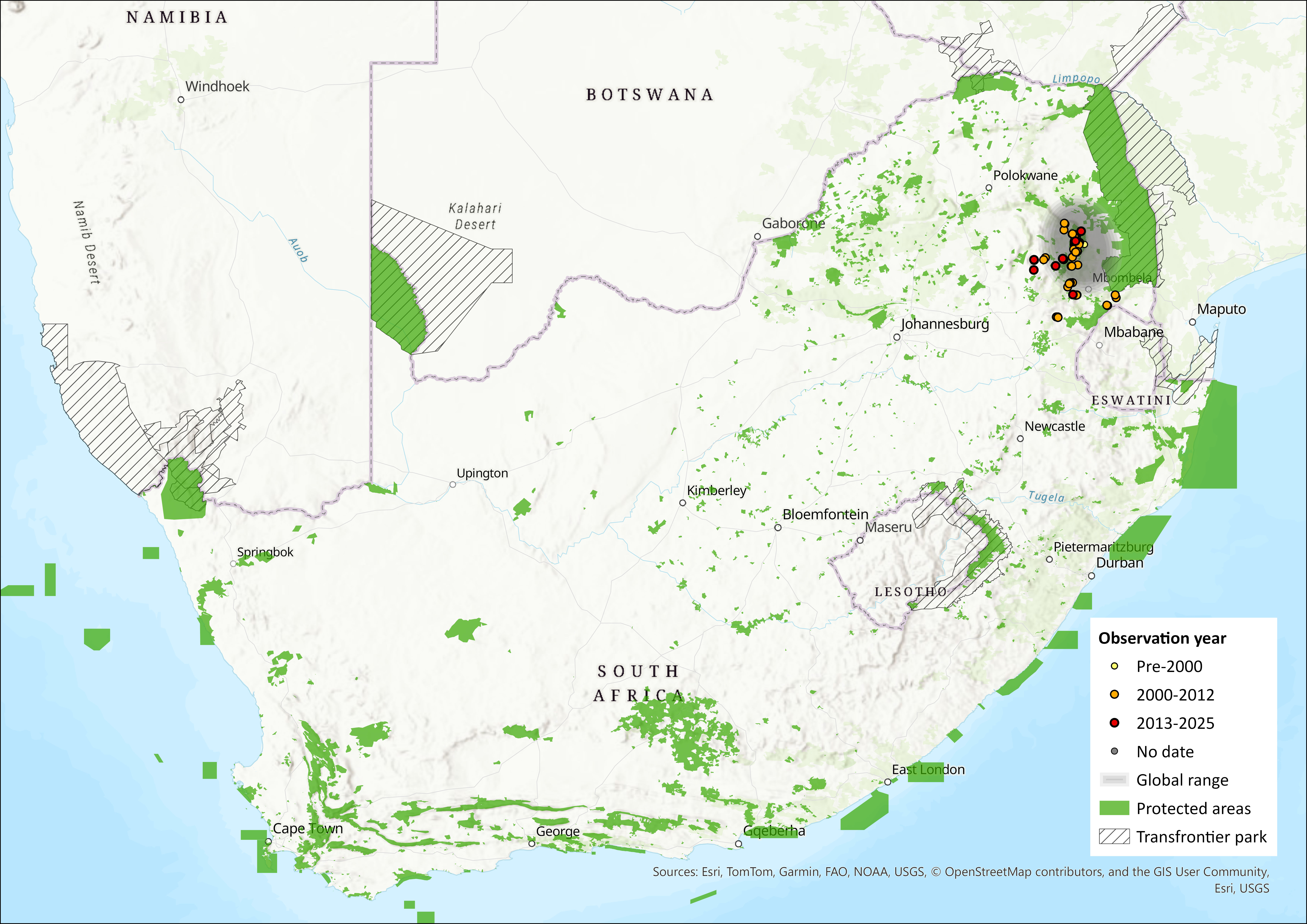 Figure 1. Distribution records for Cohen’s Horseshoe Bat (Rhinolophus cohenae) within the assessment region (South Africa, Eswatini and Lesotho). Note that distribution data is obtained from multiple sources and records have not all been individually verified.