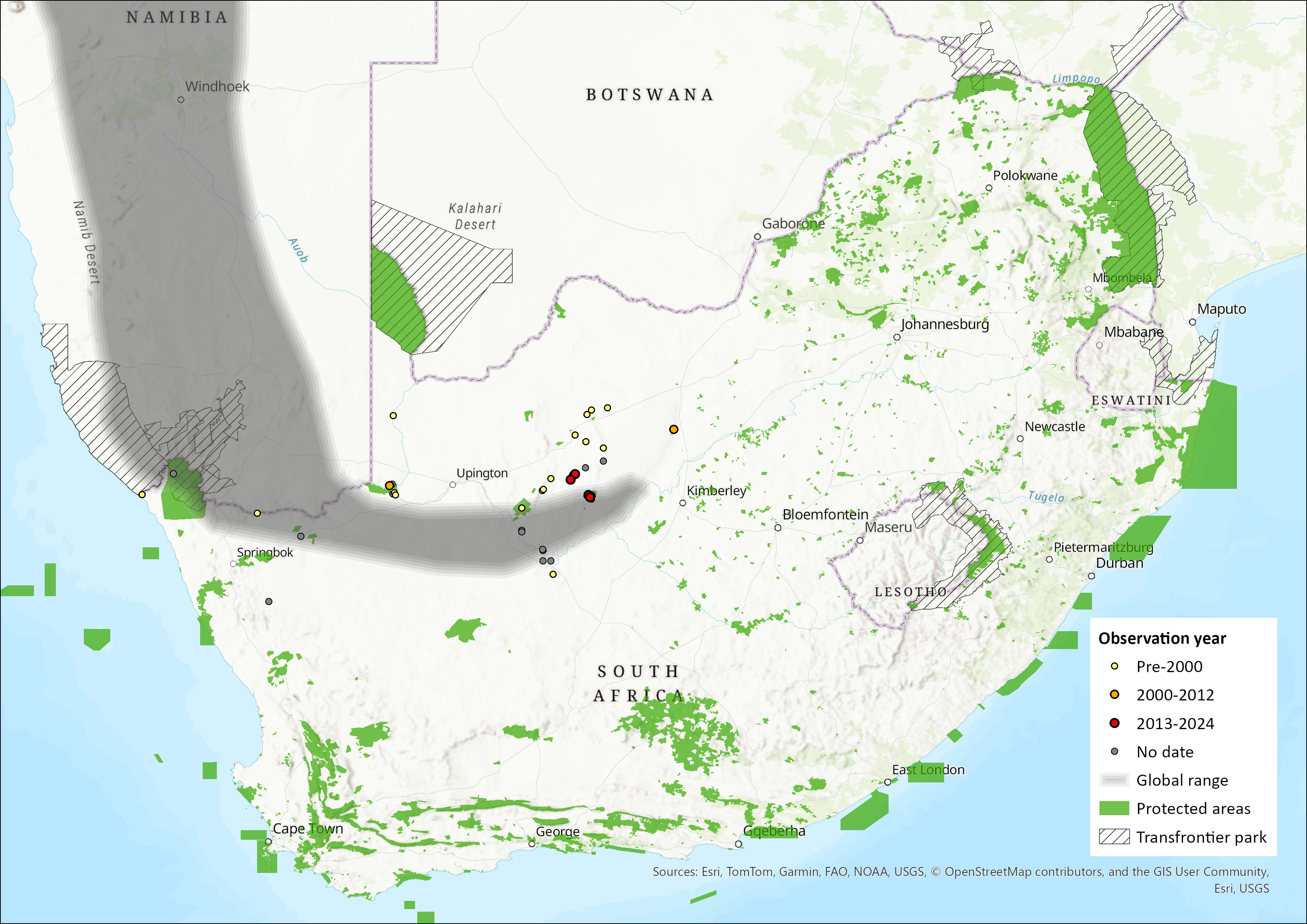 Regional population effects: Habitat is contiguous with Namibia and thus dispersal is assumed to be occurring. However, with the predicted reduction in this species’ distribution range due to future climate change (Taylor et al. 2020), dispersal between South Africa and Namibia is expected to become highly constrained.