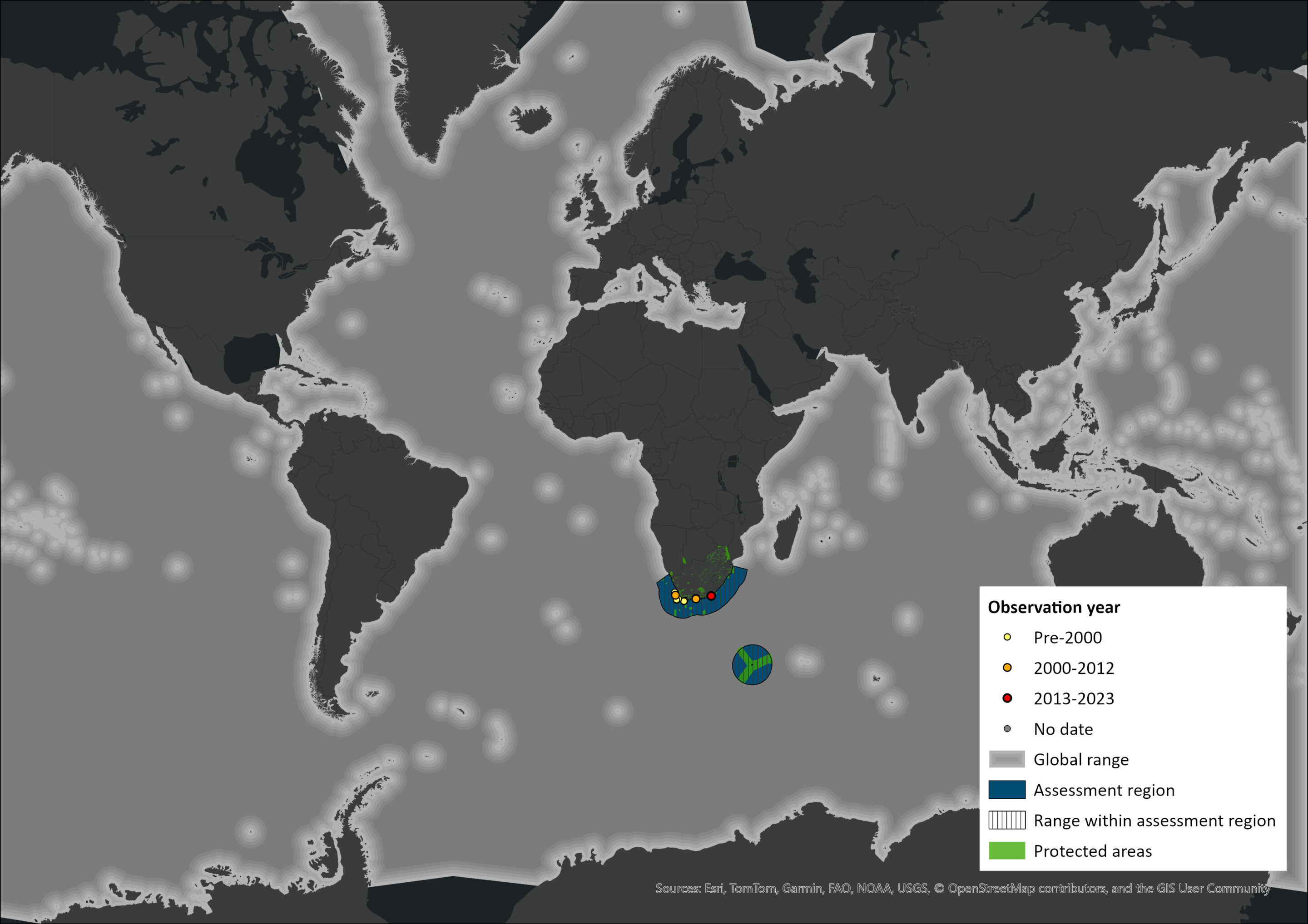 Figure 1. Distribution records for Dwarf Minke Whale (Dwarf Minke Whale) within the assessment region (South Africa, Eswatini and Lesotho). Note that distribution data is obtained from multiple sources and records have not all been individually verified.