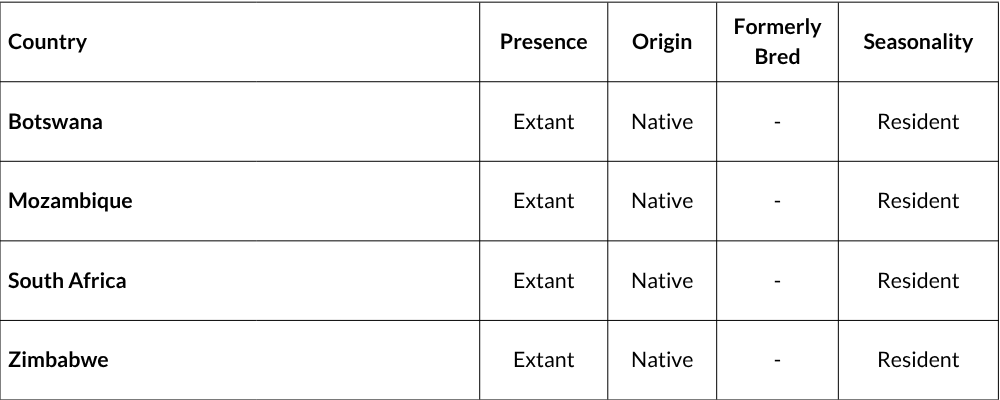 This species occurs in many protected areas across its range. Although no specific interventions are necessary at present, we suspect that destocking on agricultural and ranchlands would benefit the species. Key protected areas for the species include Mapungubwe National Park, Kruger National Park and Golden Gate National Park.