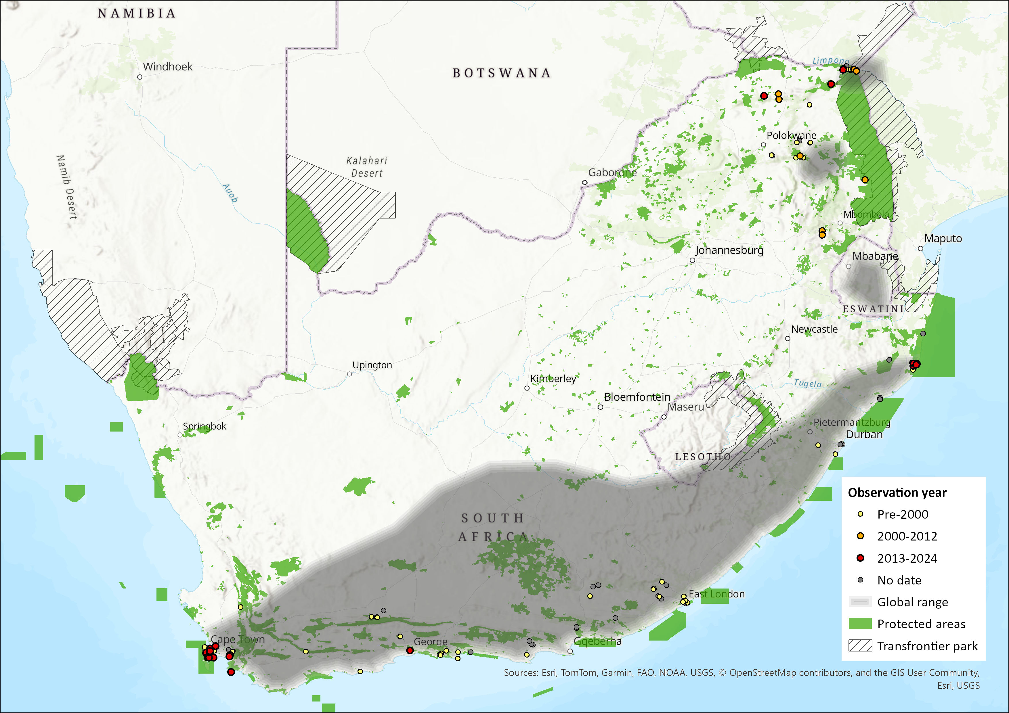 Figure 1. Distribution records for Egyptian Fruit Bat (Rousettus aegyptiacus) within the assessment region (South Africa, Eswatini and Lesotho). Note that distribution data is obtained from multiple sources and records have not all been individually verified.