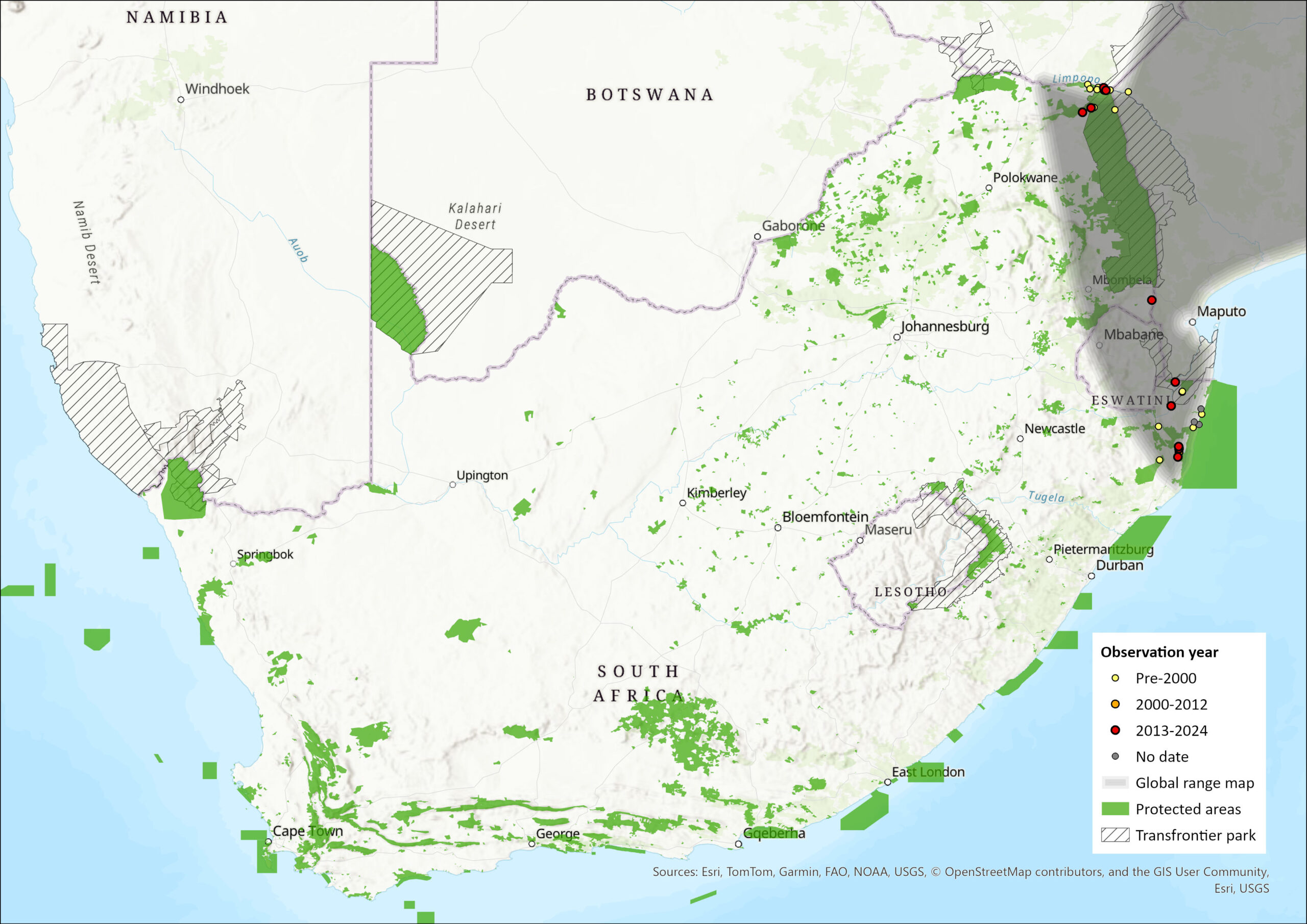 Figure 1. Distribution records for Four-toed Sengi (Petrodromus tetradactylus) within the assessment region (South Africa, Eswatini and Lesotho). Note that distribution data is obtained from multiple sources and records have not all been individually verified.