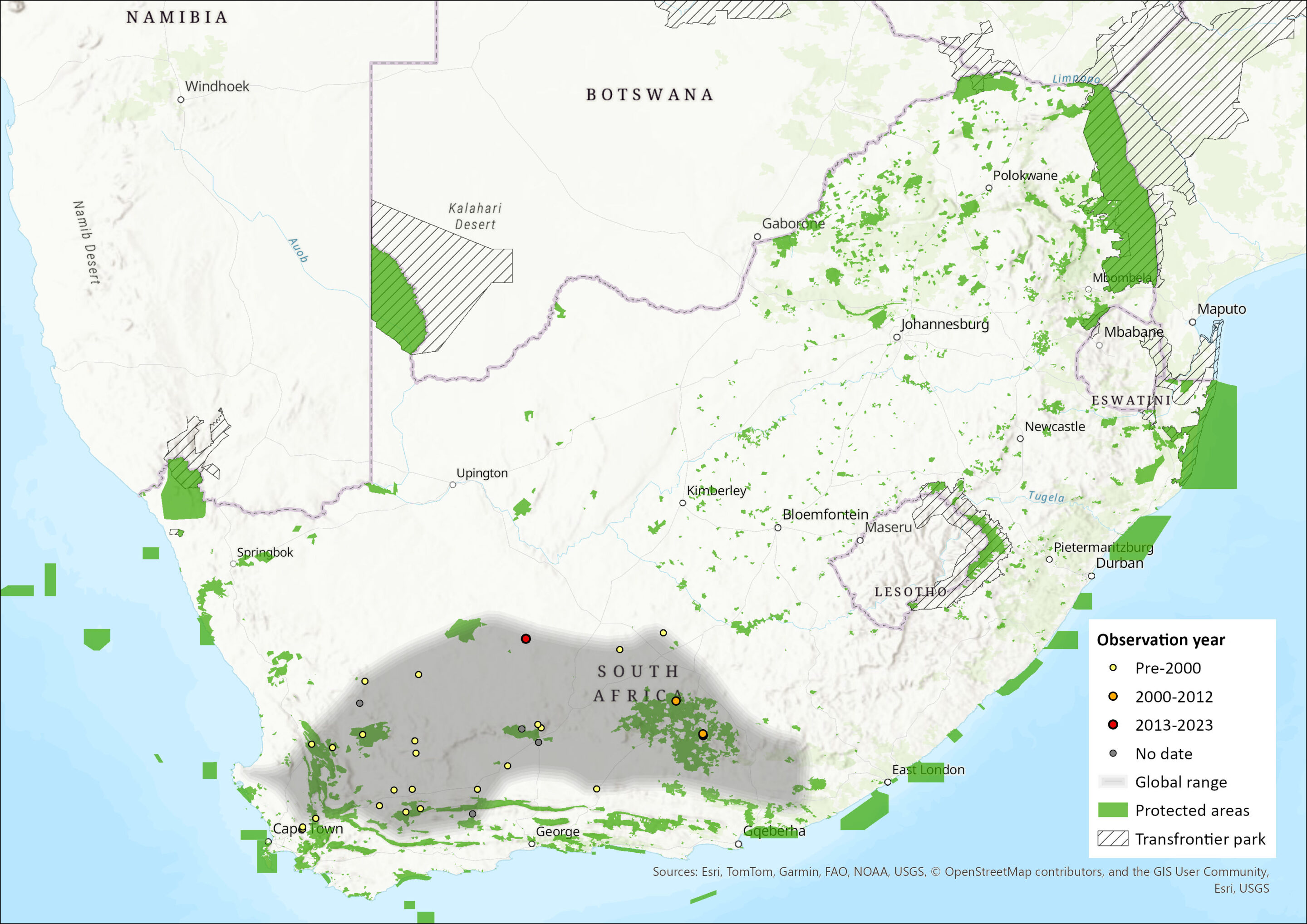 We assume this species occurs in several protected areas within its range, for example, along the Cape Fold Mountain belt. However, its current presence has recently only been confirmed for Sneeuberg Nature Reserve and Asante Sana Nature Reserve in the Eastern Cape Province (Kok et al. 2012).