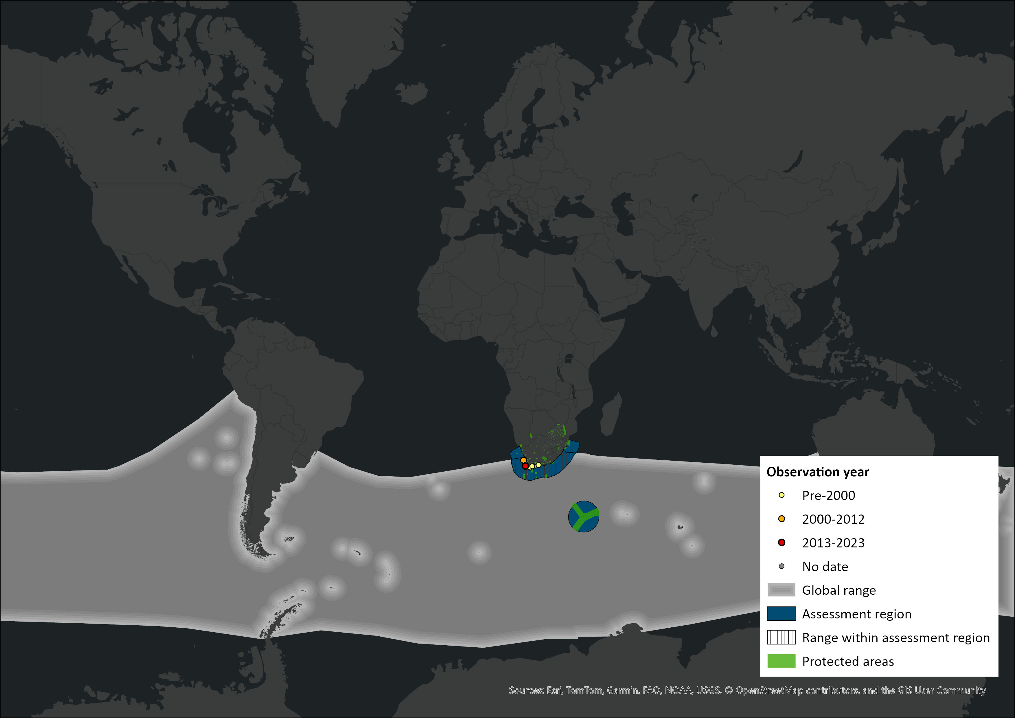 Figure 1. Distribution records for Gray’s Beaked Whale (Mesoplodon grayi) within the assessment region (South Africa, Eswatini and Lesotho). Note that distribution data is obtained from multiple sources and records have not all been individually verified.