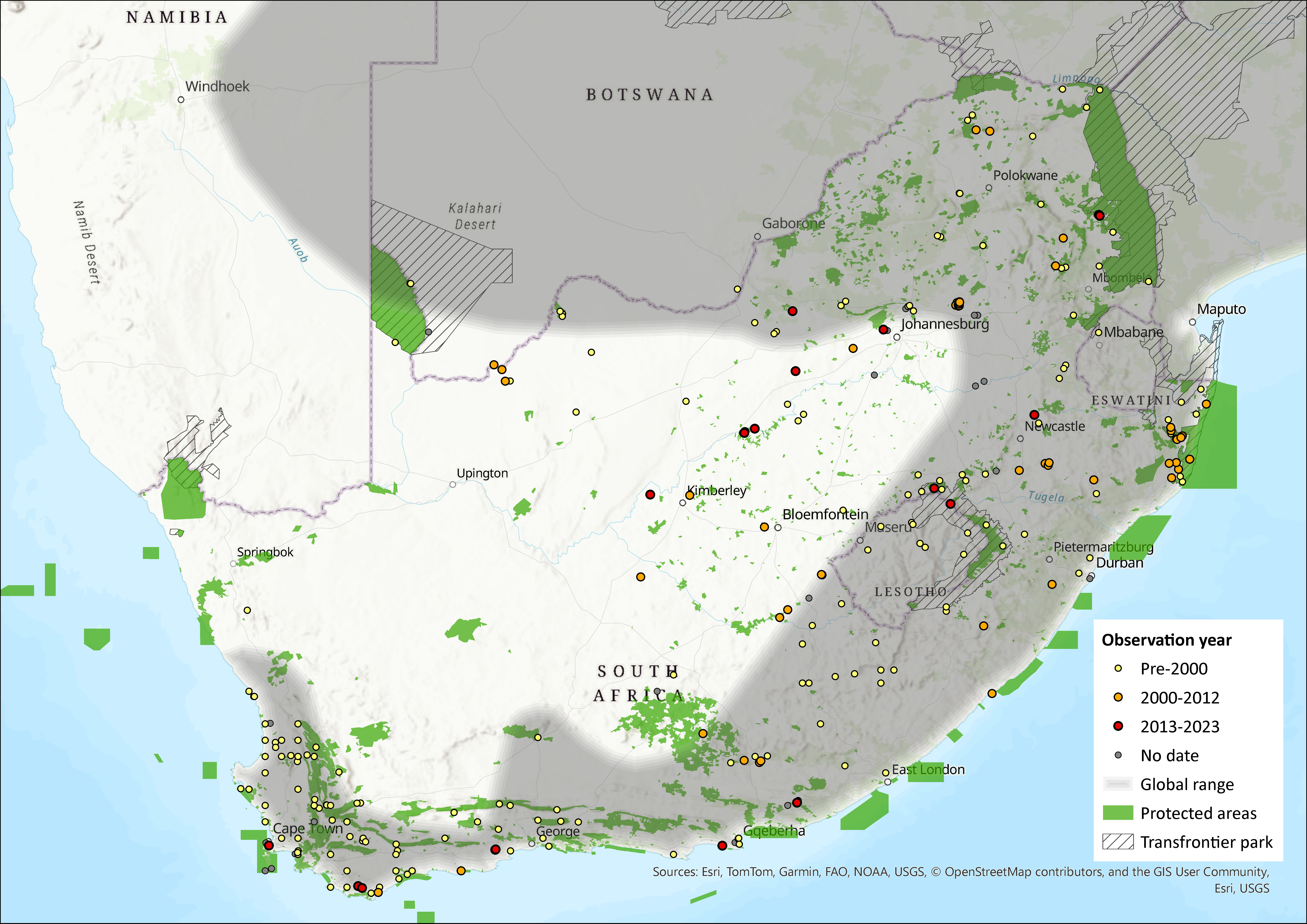 Figure 1. Distribution records for Grey Climbing Mouse (Poemys melanotis) within the assessment region (South Africa, Eswatini and Lesotho). Note that distribution data is obtained from multiple sources and records have not all been individually verified.