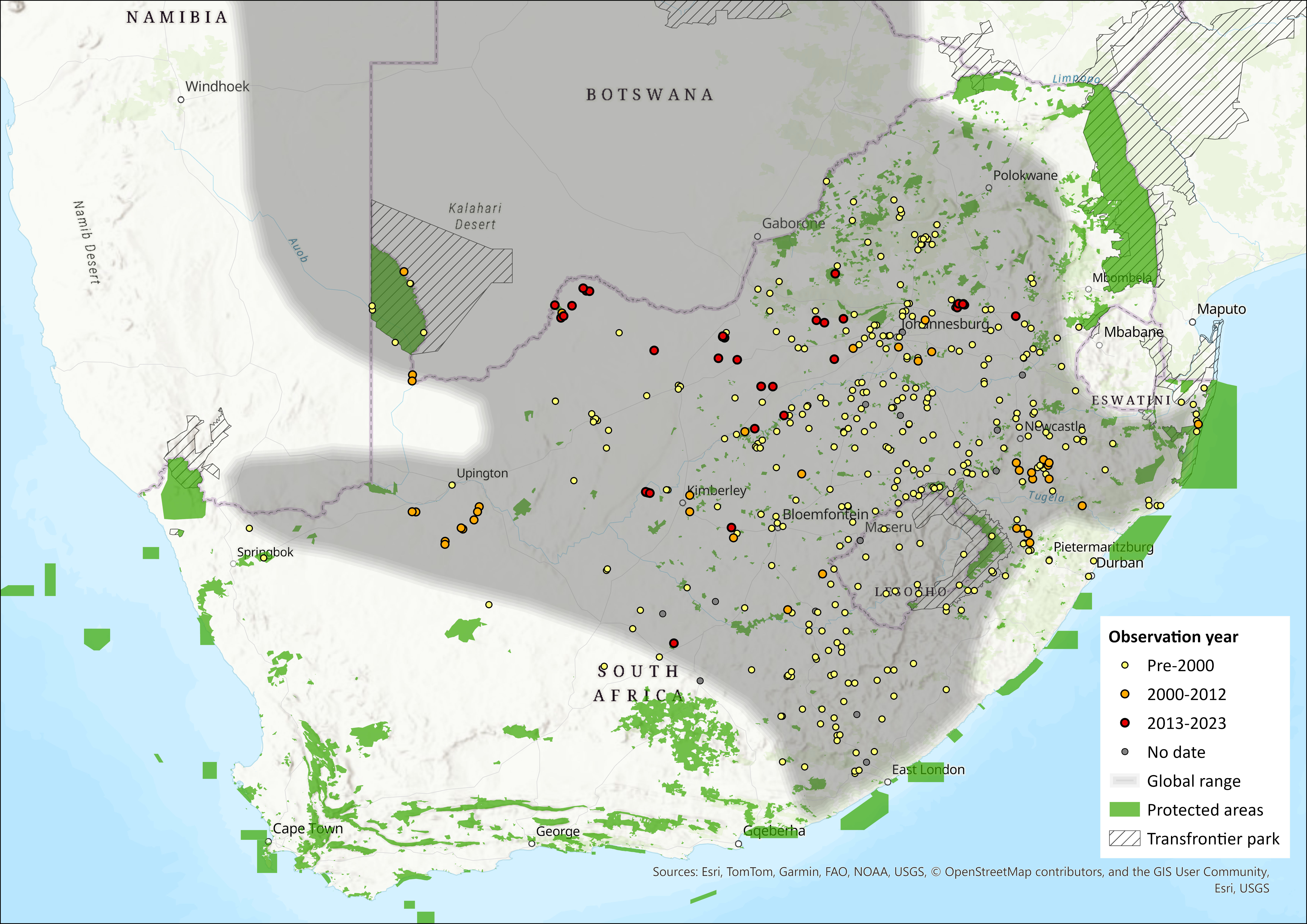 Figure 1. Distribution records for Highveld Gerbil (Gerbilliscus brantsii) within the assessment region (South Africa, Eswatini and Lesotho). Note that distribution data is obtained from multiple sources and records have not all been individually verified.