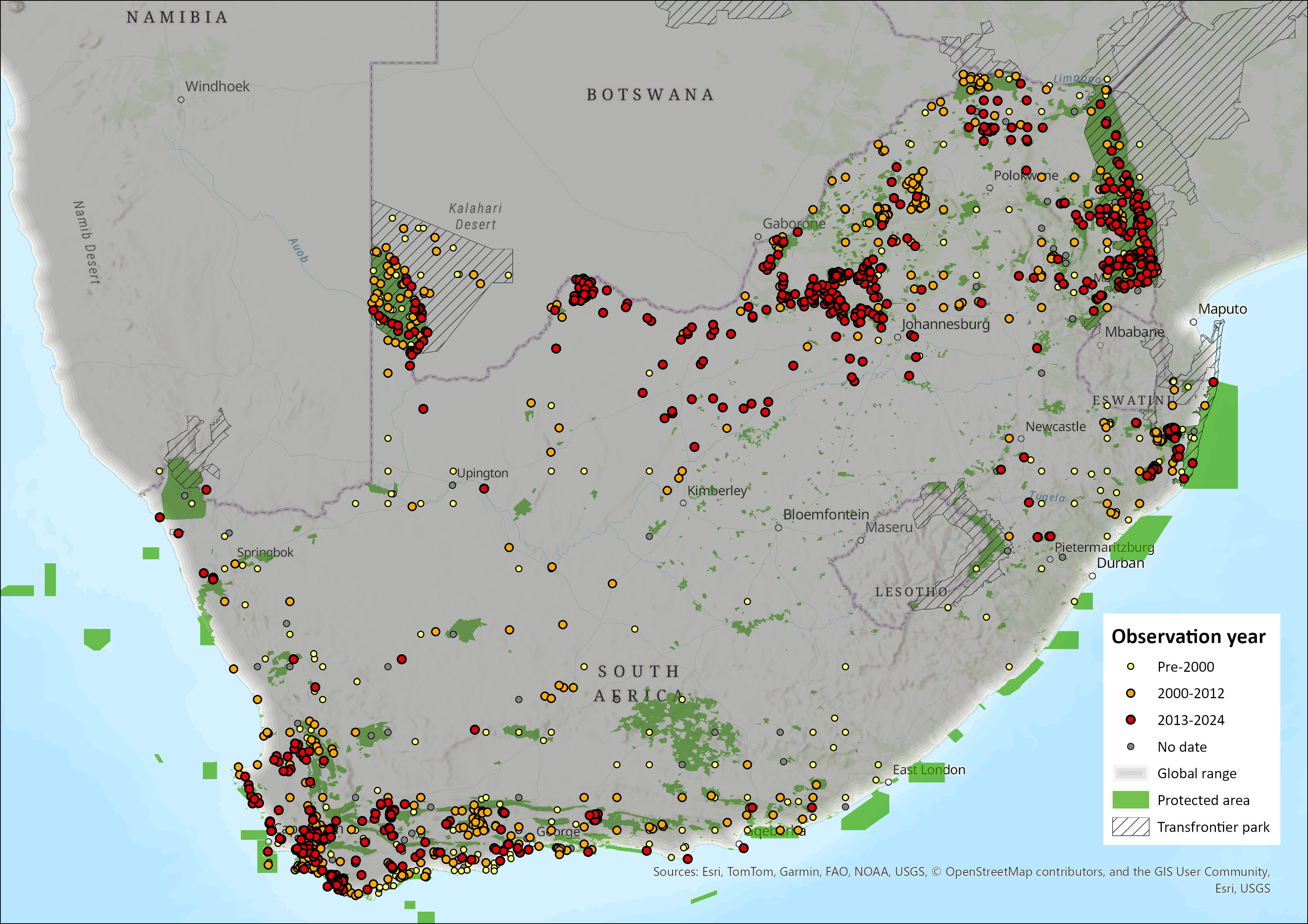 Figure 1. Distribution records for Honey Badger (Mellivora capensis) within the assessment region (South Africa, Eswatini and Lesotho). Note that distribution data is obtained from multiple sources and records have not all been individually verified.