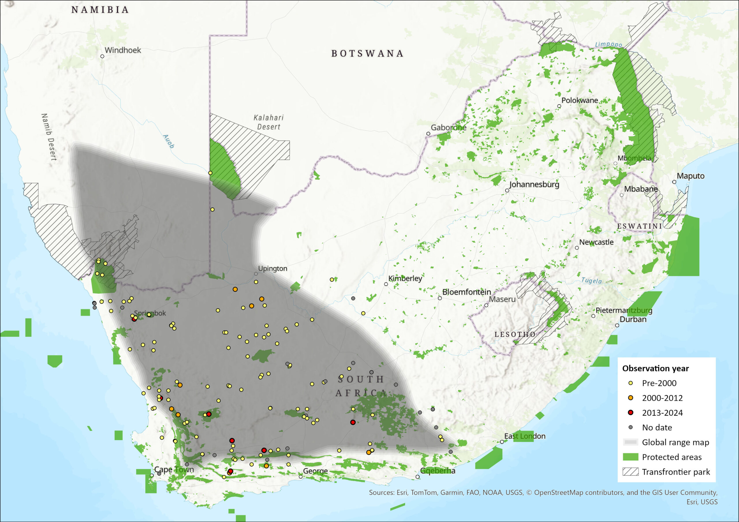 Figure 1. Distribution records for Karoo Round-eared Sengi (Macroscelides proboscideus) within the assessment region (South Africa, Eswatini and Lesotho). Note that distribution data is obtained from multiple sources and records have not all been individually verified.