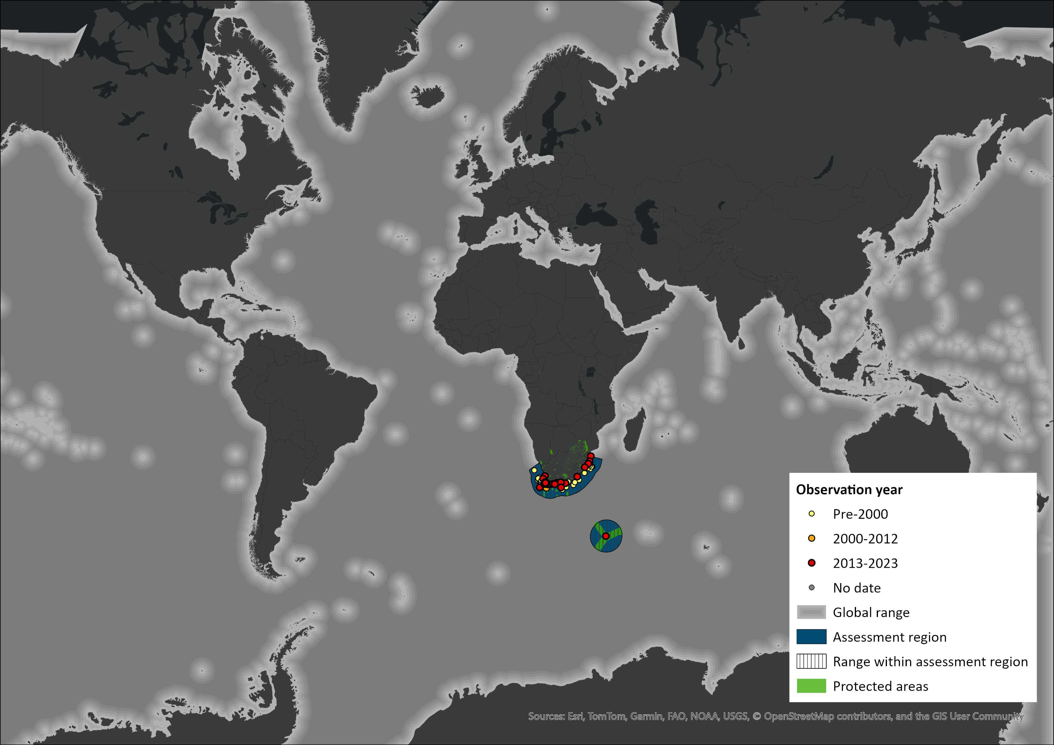 Figure 1. Distribution records for Killer Whale (Orcinus orca) within the assessment region (South Africa, Eswatini and Lesotho). Note that distribution data is obtained from multiple sources and records have not all been individually verified.