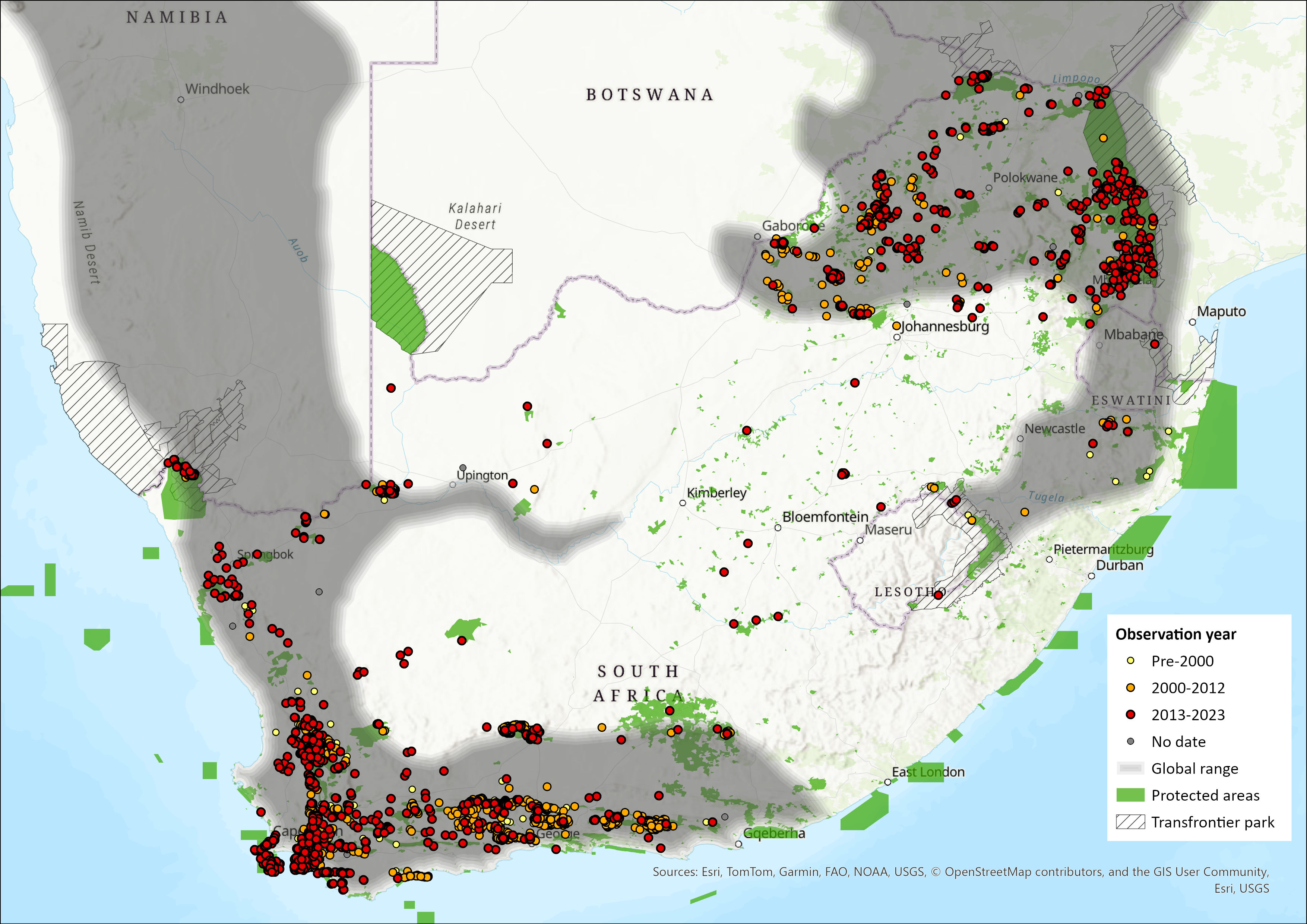 Figure 1. Distribution records for Klipspringer (Oreotragus oreotragus) within the assessment region (South Africa, Eswatini and Lesotho). Note that distribution data is obtained from multiple sources and records have not all been individually verified.