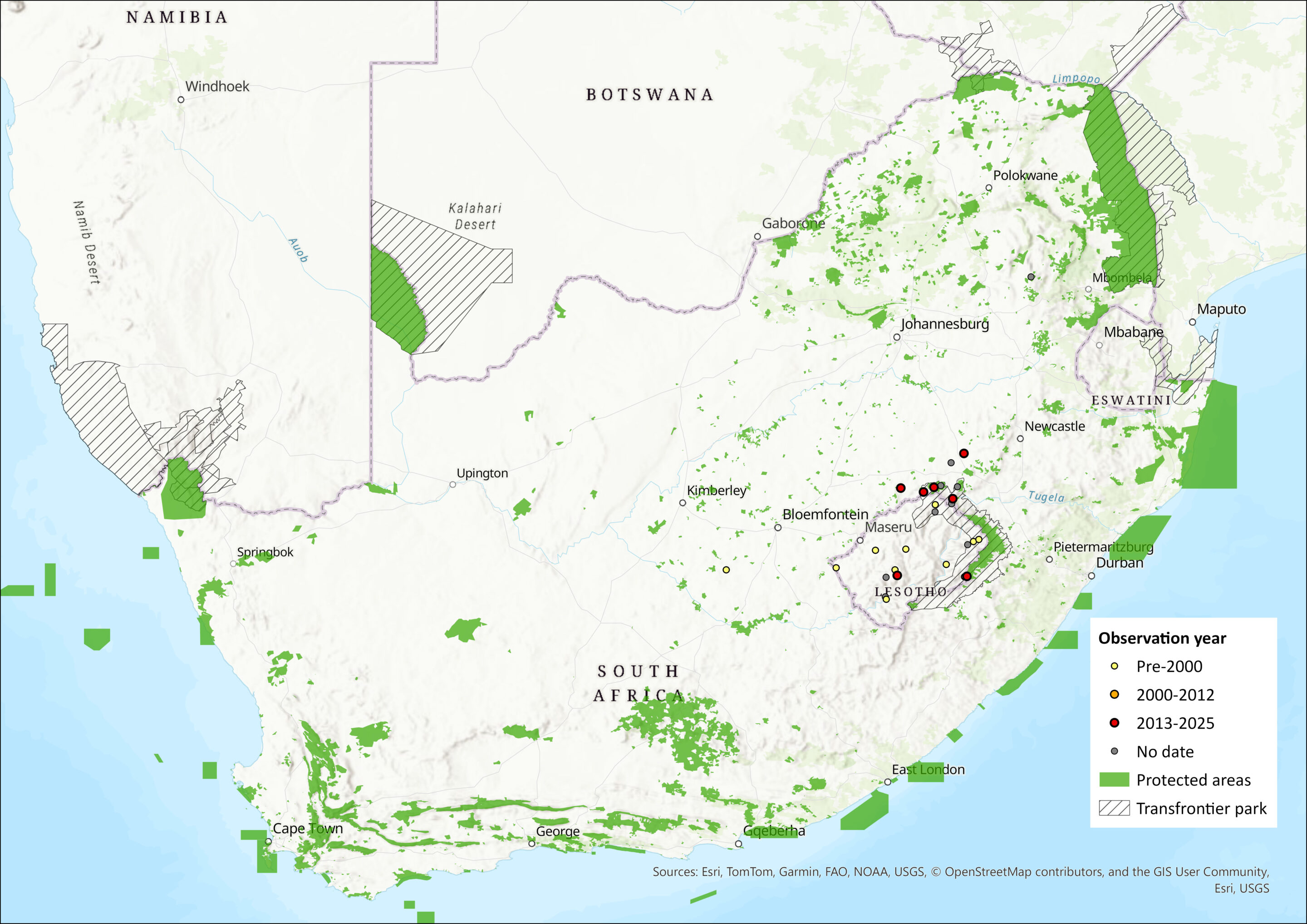 Figure 1. Distribution records for Lesotho Horseshoe Bat (Rhinolophus cervenyi) within the assessment region (South Africa, Eswatini and Lesotho). Note that distribution data is obtained from multiple sources and records have not all been individually verified.