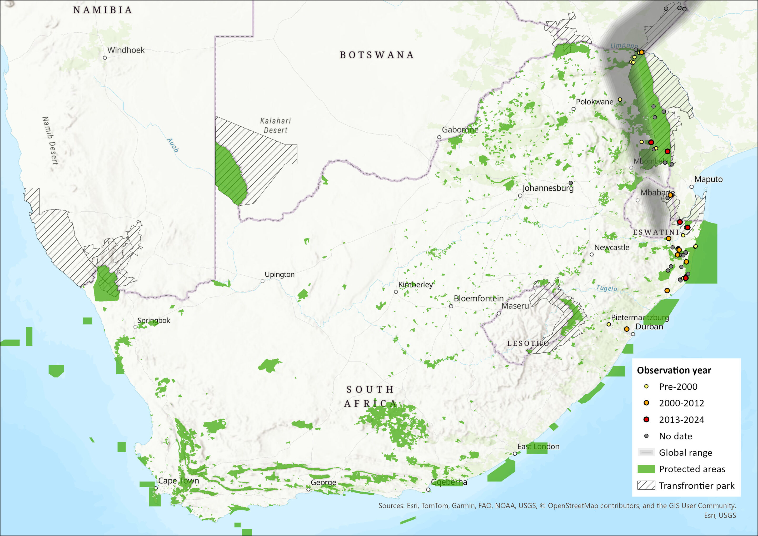 Figure 1. Distribution records for Lesser Yellow House Bat (Scotophilus viridis) within the assessment region (South Africa, Eswatini and Lesotho). Note that distribution data is obtained from multiple sources and records have not all been individually verified.
