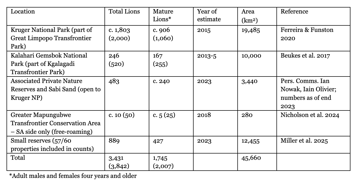 - Updated Lion census for Kruger NP and the South African side of the Kgalagadi TP are currently (2025) underway