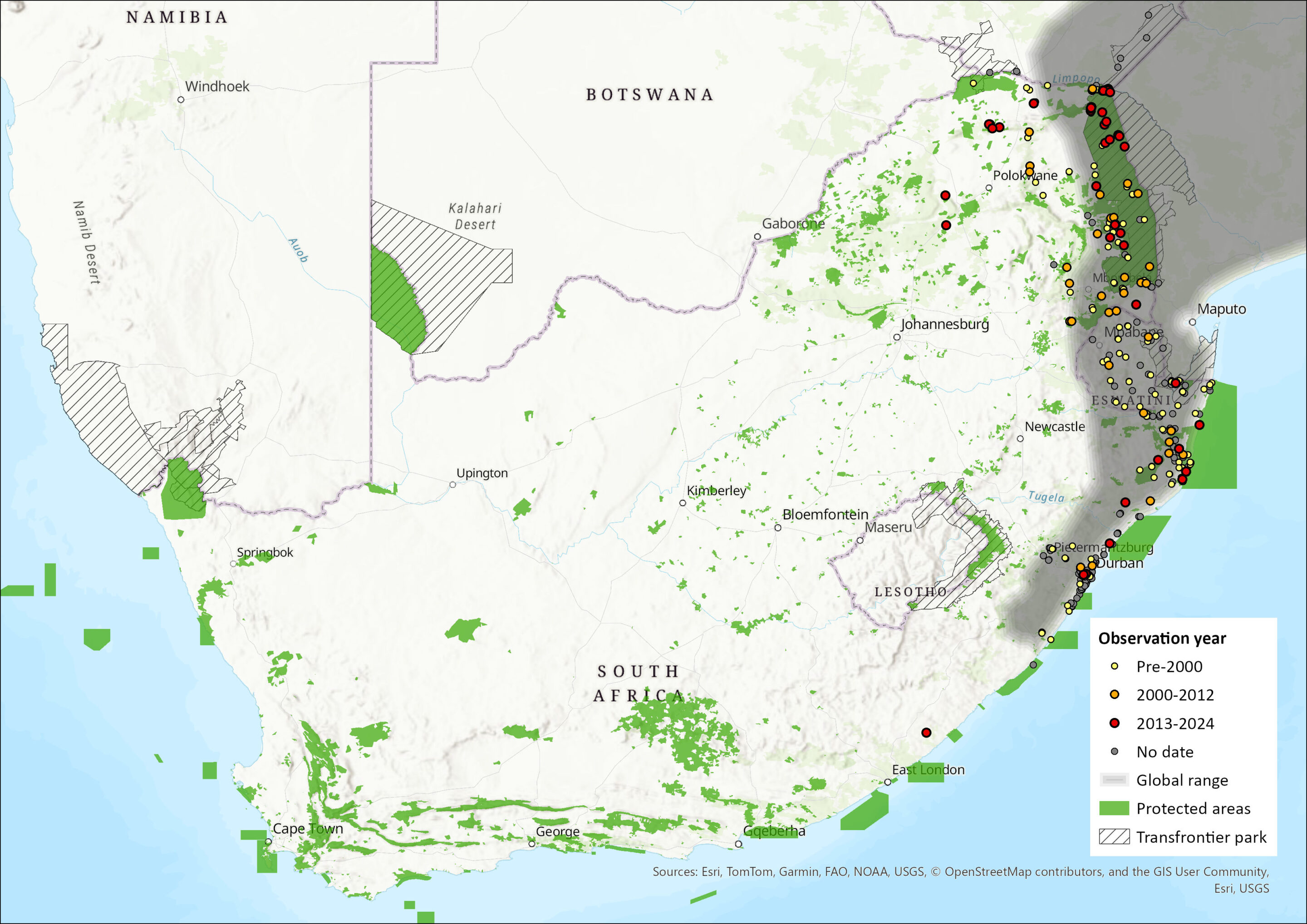 Figure 1. Distribution records for Little Free-tailed Bat (Mops pumilus) within the assessment region (South Africa, Eswatini and Lesotho). Note that distribution data is obtained from multiple sources and records have not all been individually verified.