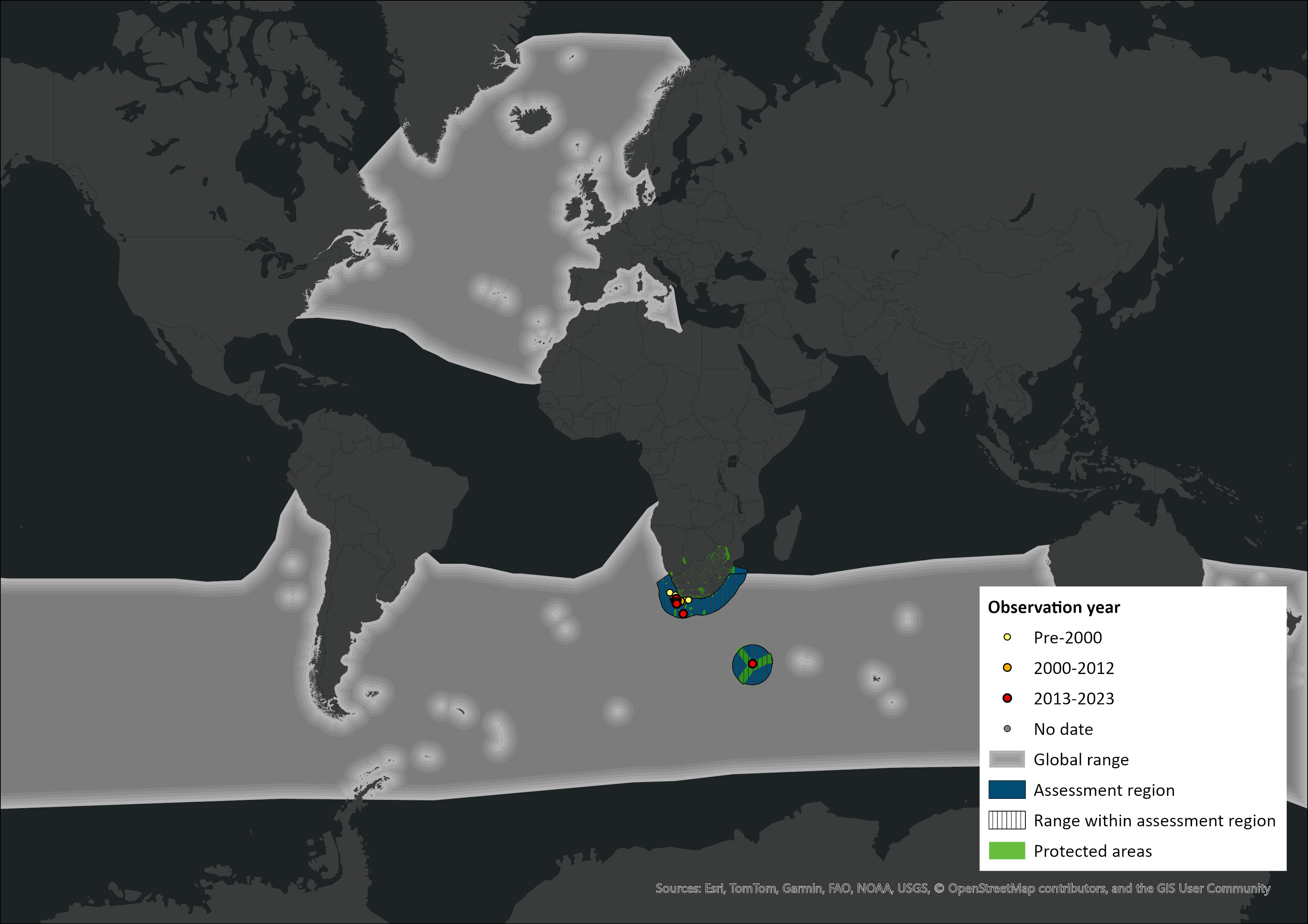 Figure 1. Distribution records for Long-finned Pilot Whale (Globicephala melas) within the assessment region (South Africa, Eswatini and Lesotho). Note that distribution data is obtained from multiple sources and records have not all been individually verified.