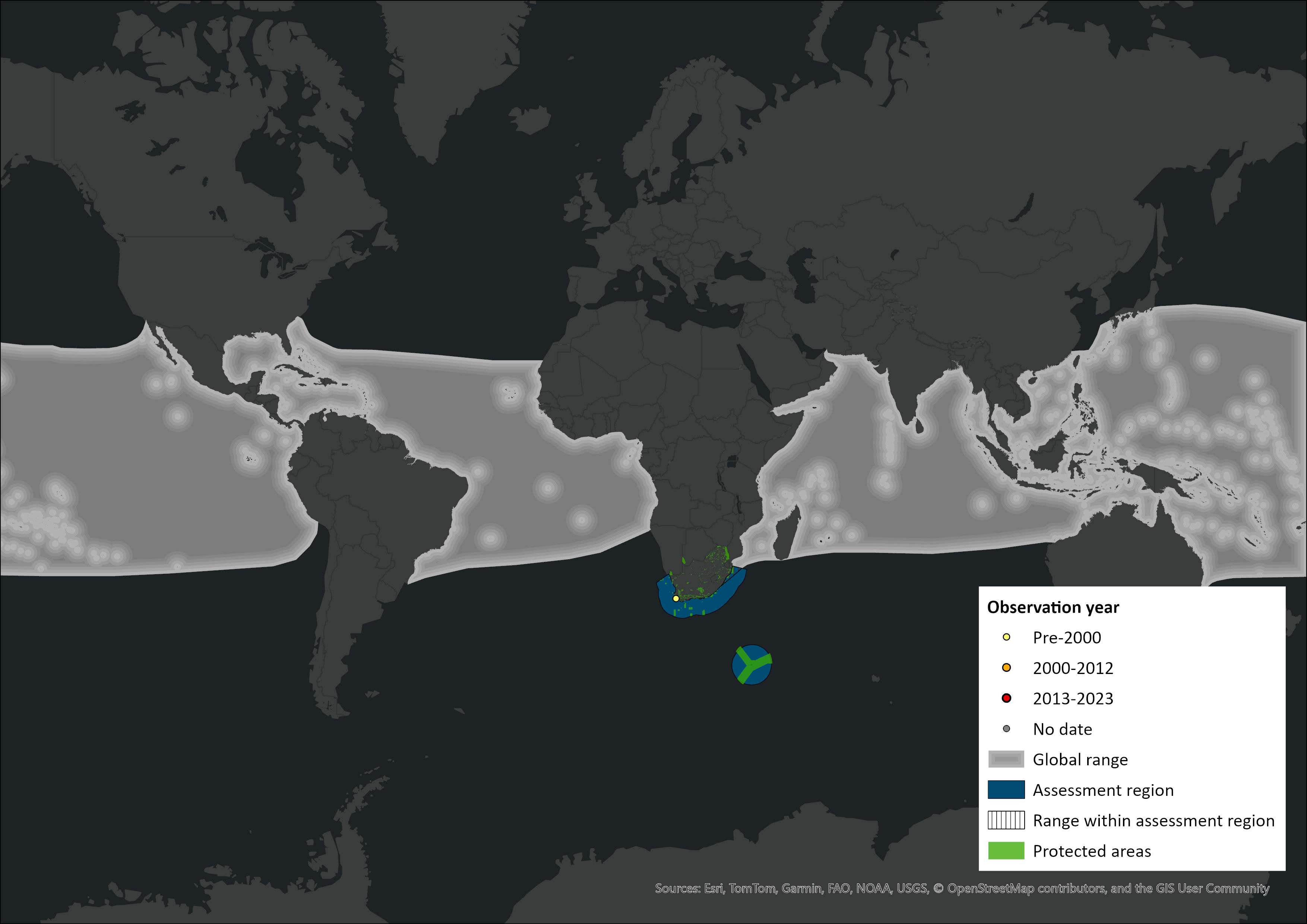 Figure 1. Distribution records for Melon-headed Whale (Peponocephala electra) within the assessment region (South Africa, Eswatini and Lesotho). Note that distribution data is obtained from multiple sources and records have not all been individually verified.