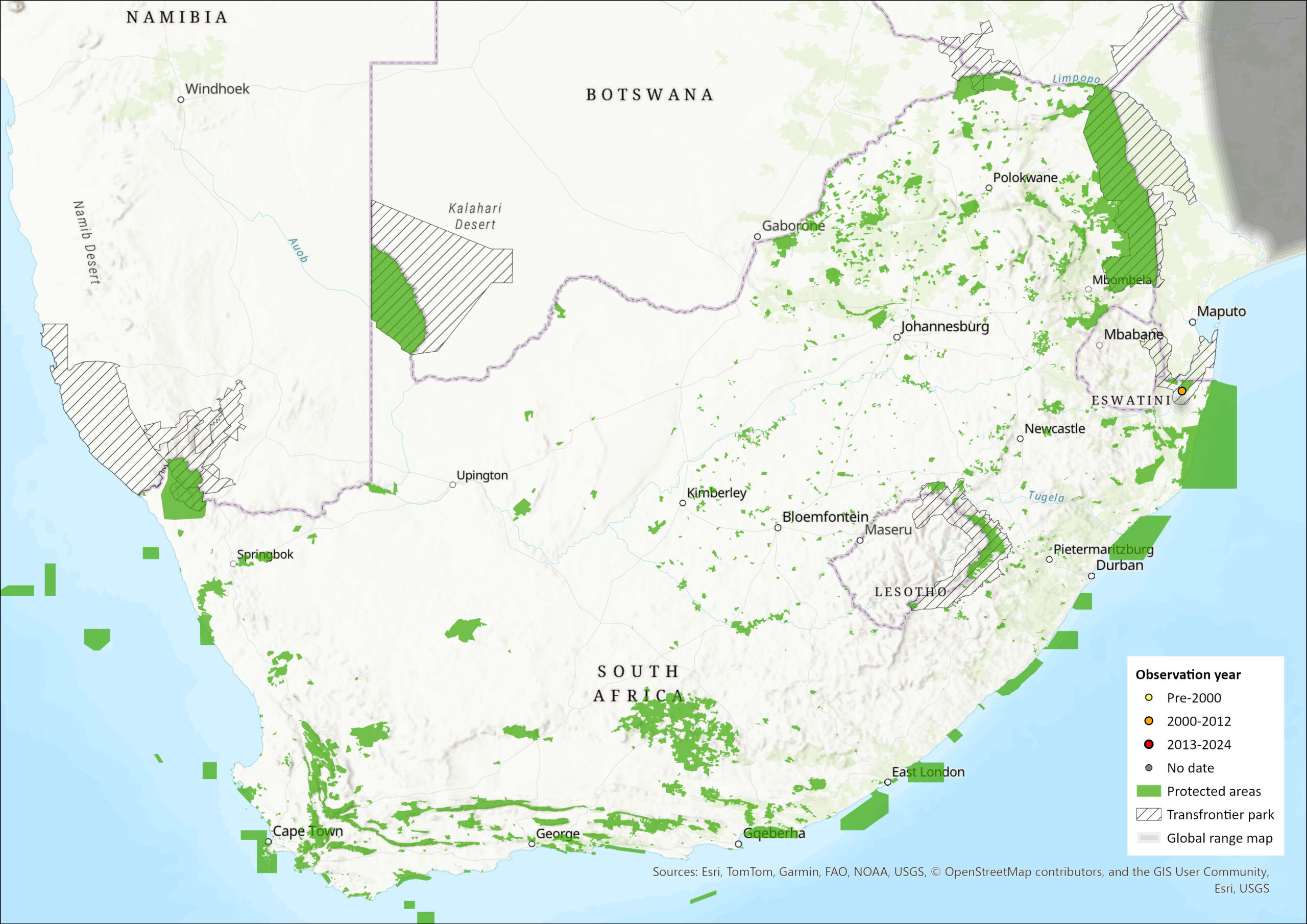 Figure 1. Distribution records for Mozambique Dwarf Galago (Paragalago granti) within the assessment region (South Africa, Eswatini and Lesotho). Note that distribution data is obtained from multiple sources and records have not all been individually verified.