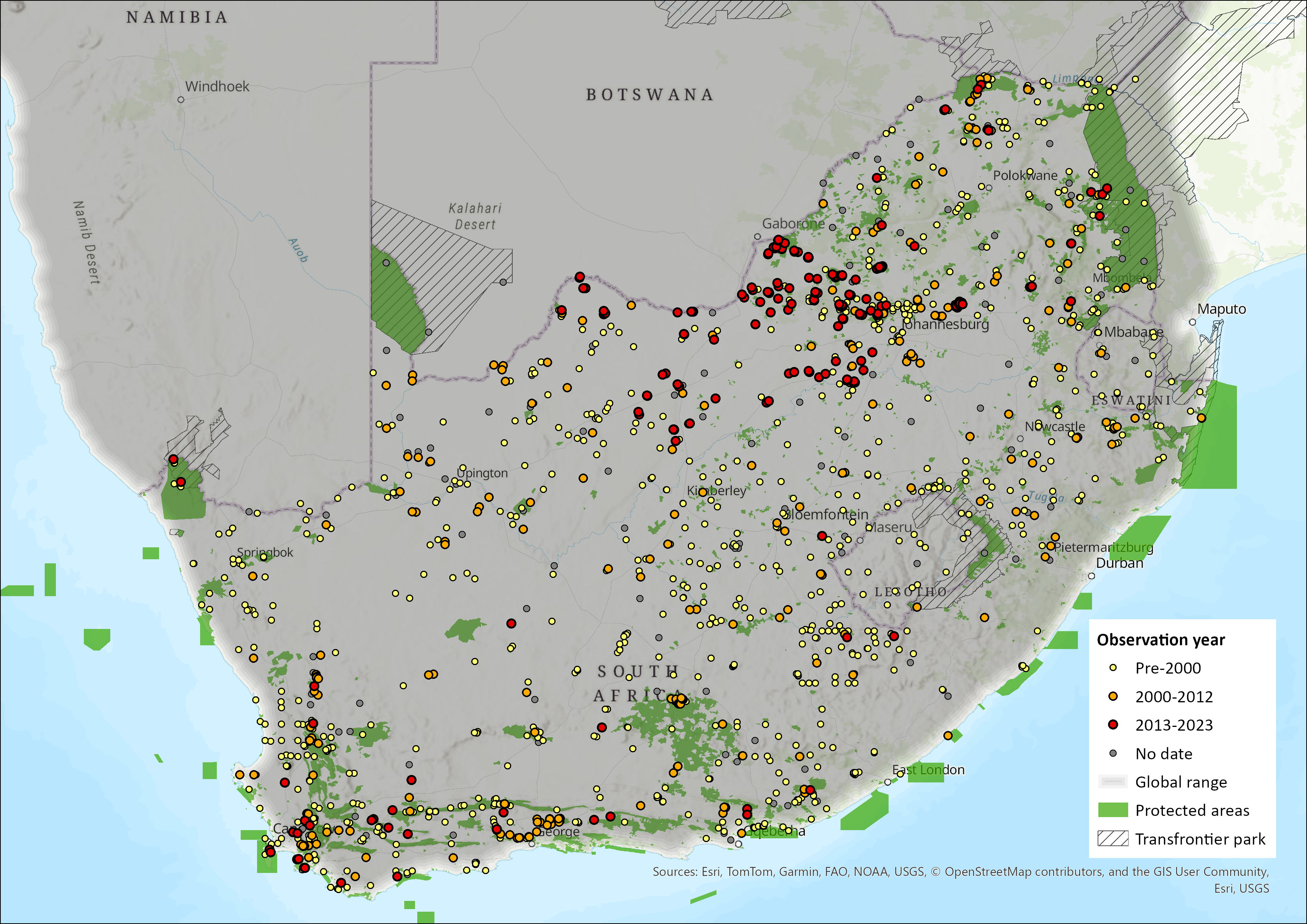 Figure 1. Distribution records for Namaqua Rock Mouse (Micaelamys namaquensis) within the assessment region (South Africa, Eswatini and Lesotho). Note that distribution data is obtained from multiple sources and records have not all been individually verified.