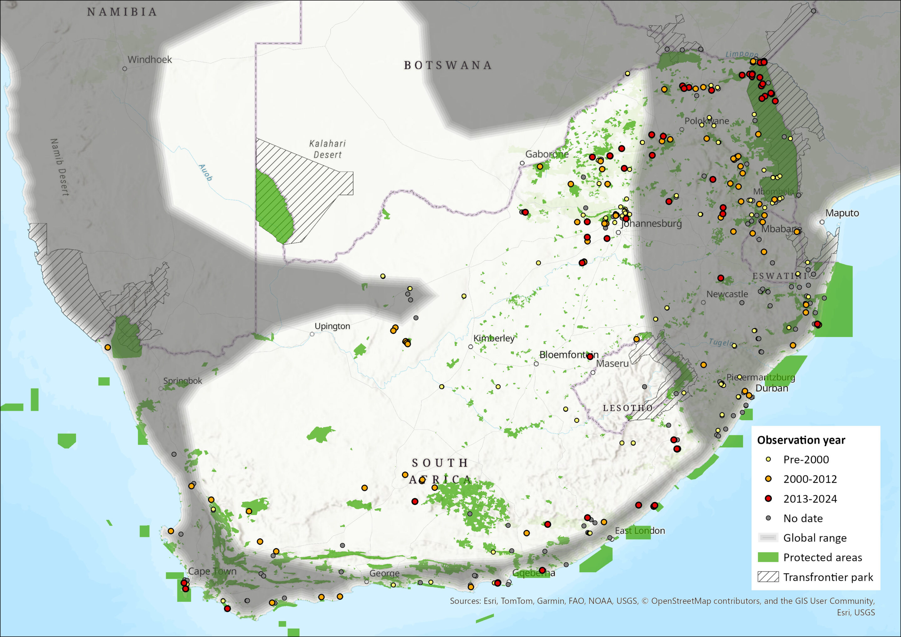 Figure 1. Distribution records for Natal Long-fingered Bat (Miniopterus natalensis) within the assessment region (South Africa, Eswatini and Lesotho). Note that distribution data is obtained from multiple sources and records have not all been individually verified.