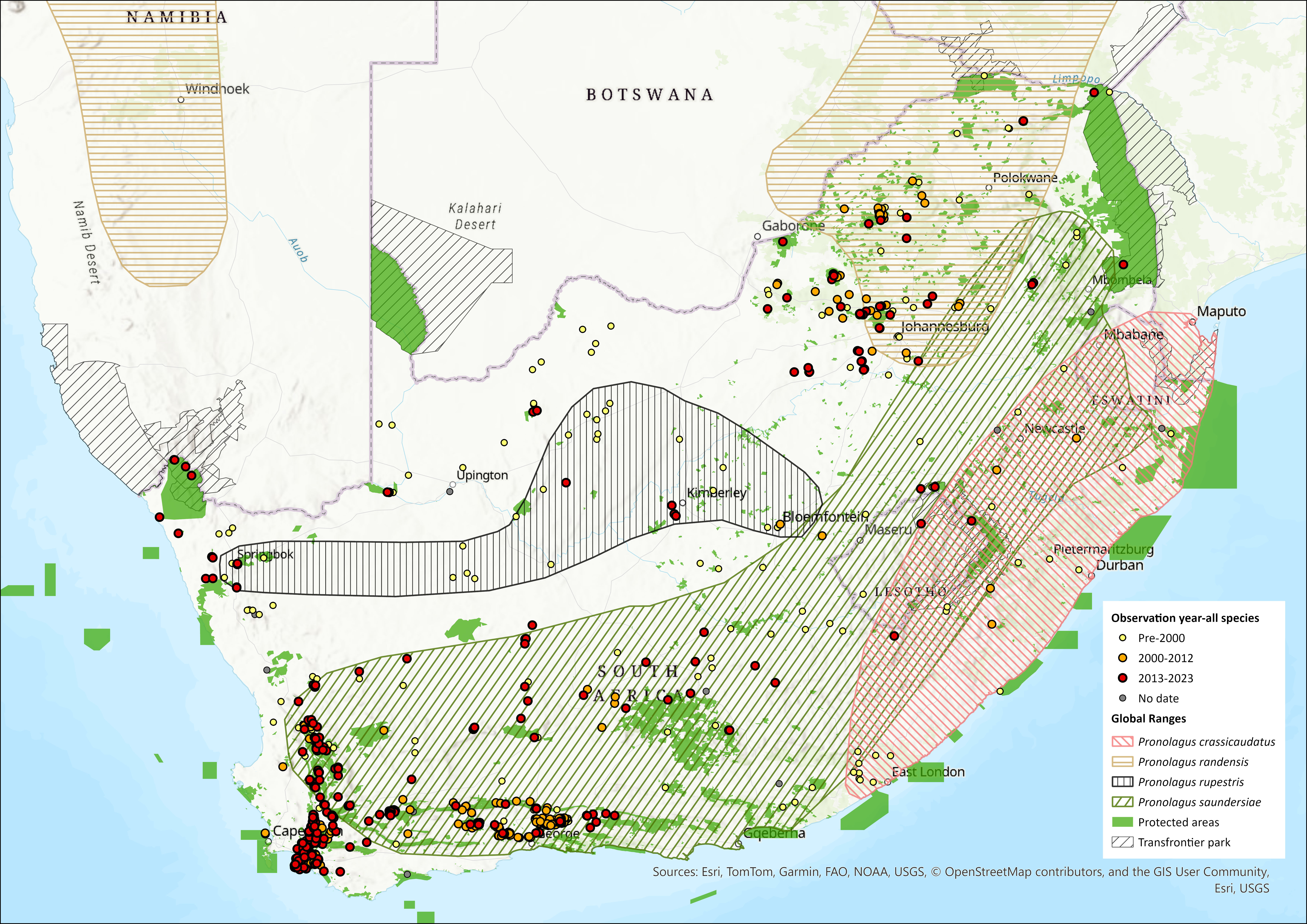 Figure 1. Distribution records for Natal Red Rock Hare (Pronolagus crassicaudatus) within the assessment region (South Africa, Eswatini and Lesotho). Note that distribution data is obtained from multiple sources and records have not all been individually verified.
