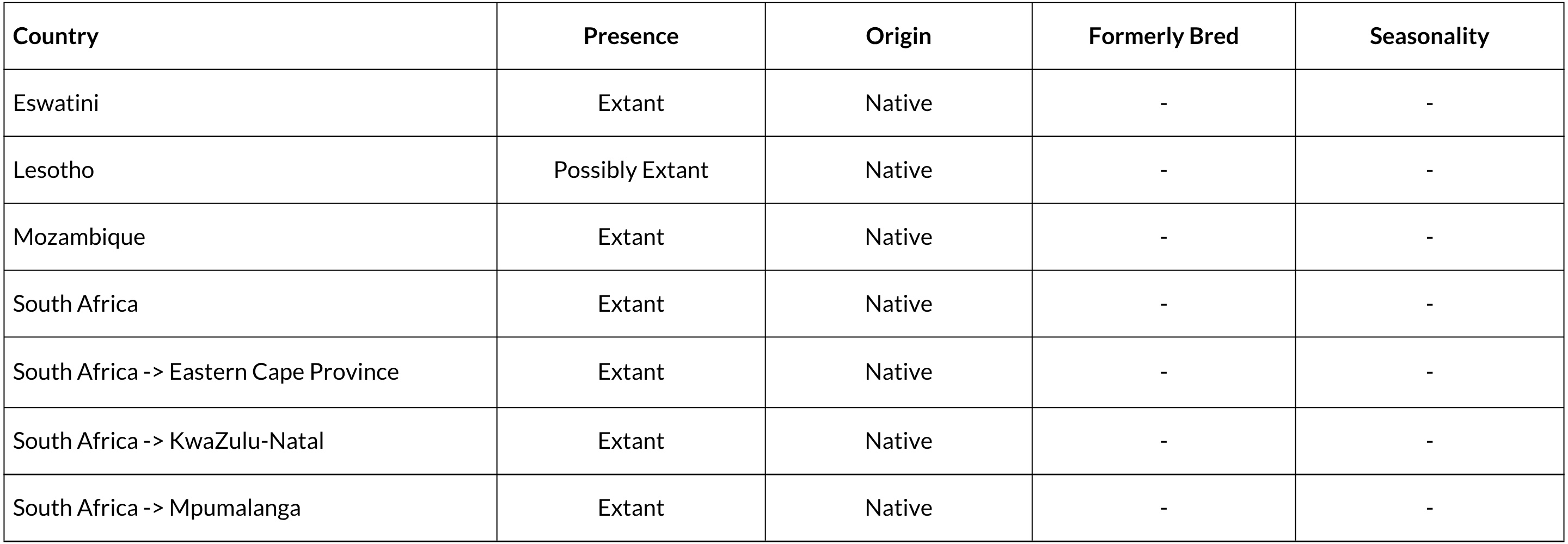 P. crassicaudatus is near endemic to the assessment region, with only a tiny part of its range in southern Mozambique in the Maputo Province (known from only two records there, Happold 2013). It is found in southeastern South Africa in the provinces of Eastern Cape, KwaZulu-Natal and Mpumalanga (Duthie & Robinson 1990; Matthee et al. 2004), and in Eswatini in the Lumbobo and highveld regions where it is considered uncommon (Monadjem 1998). Although Meester et al. (1986) indicated that it occurs in eastern Lesotho, as it is found from sea level to 1,550 m in elevation (Duthie and Robinson 1990), it is unlikely to occur extensively in Lesotho. Thus, field surveys and specimens are needed to confirm its presence in the country (Lynch 1994). It does occur against the grassy slopes in the KwaZulu-Natal Drakensberg (Pringle 1974). While it is not recorded from the Free State or northeast Eastern Cape (Lynch 1983, 1989), some specimens from the northeastern Eastern Cape possessed both P. rupestris and P. crassicaudatus characters (Lynch 1994).