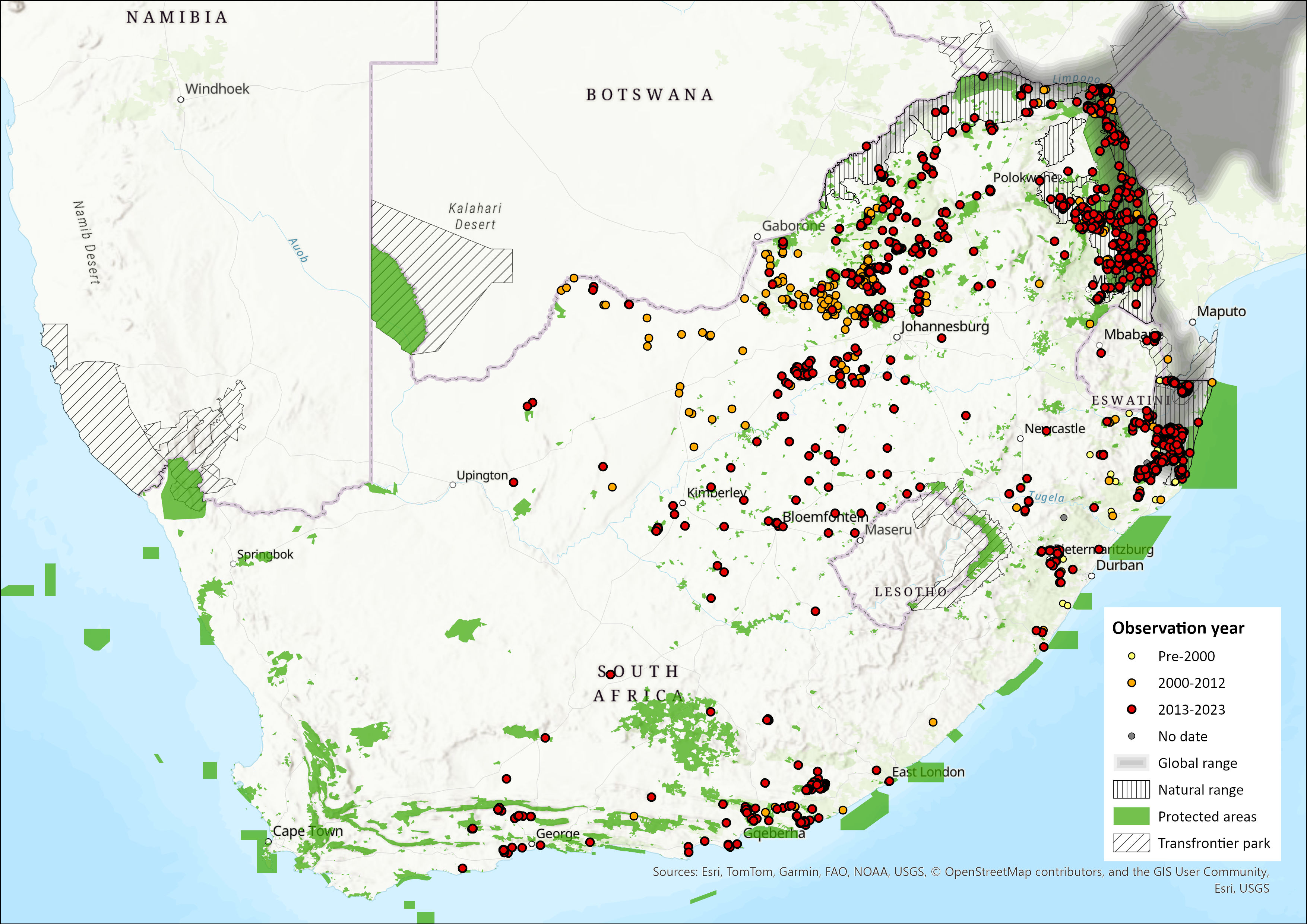 Figure 1. Distribution records for Nyala (Tragelaphus angasii) within the assessment region (South Africa, Eswatini and Lesotho). Note that distribution data is obtained from multiple sources and records have not all been individually verified.