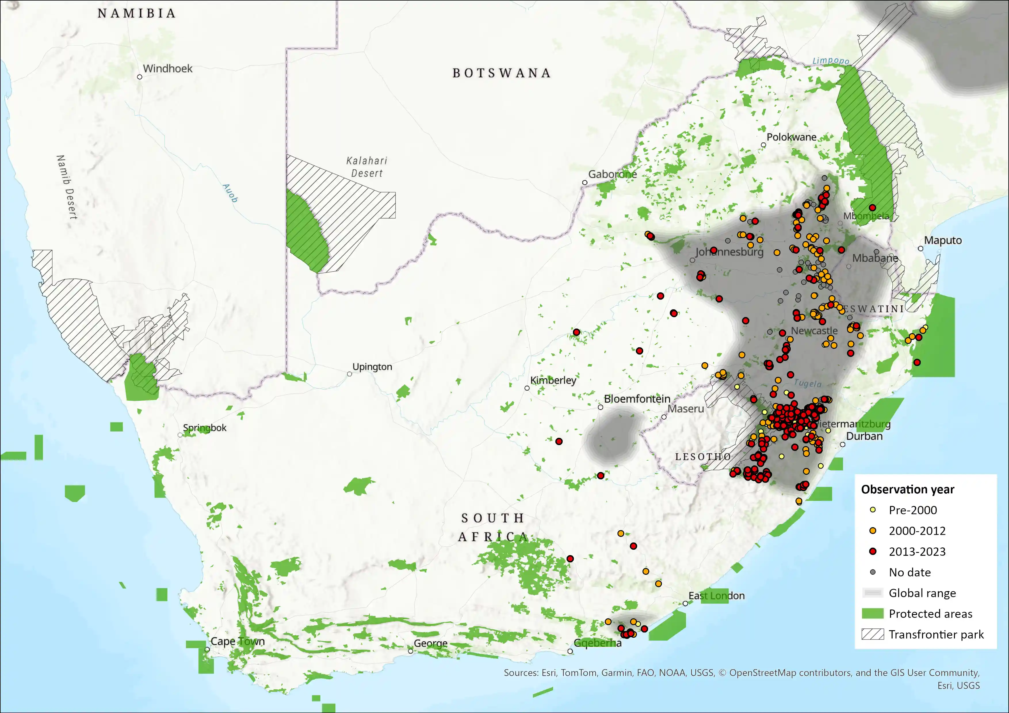 Figure 1. Distribution records for Oribi (Ourebia ourebi) within the assessment region (South Africa, Eswatini and Lesotho). Note that distribution data is obtained from multiple sources and records have not all been individually verified.