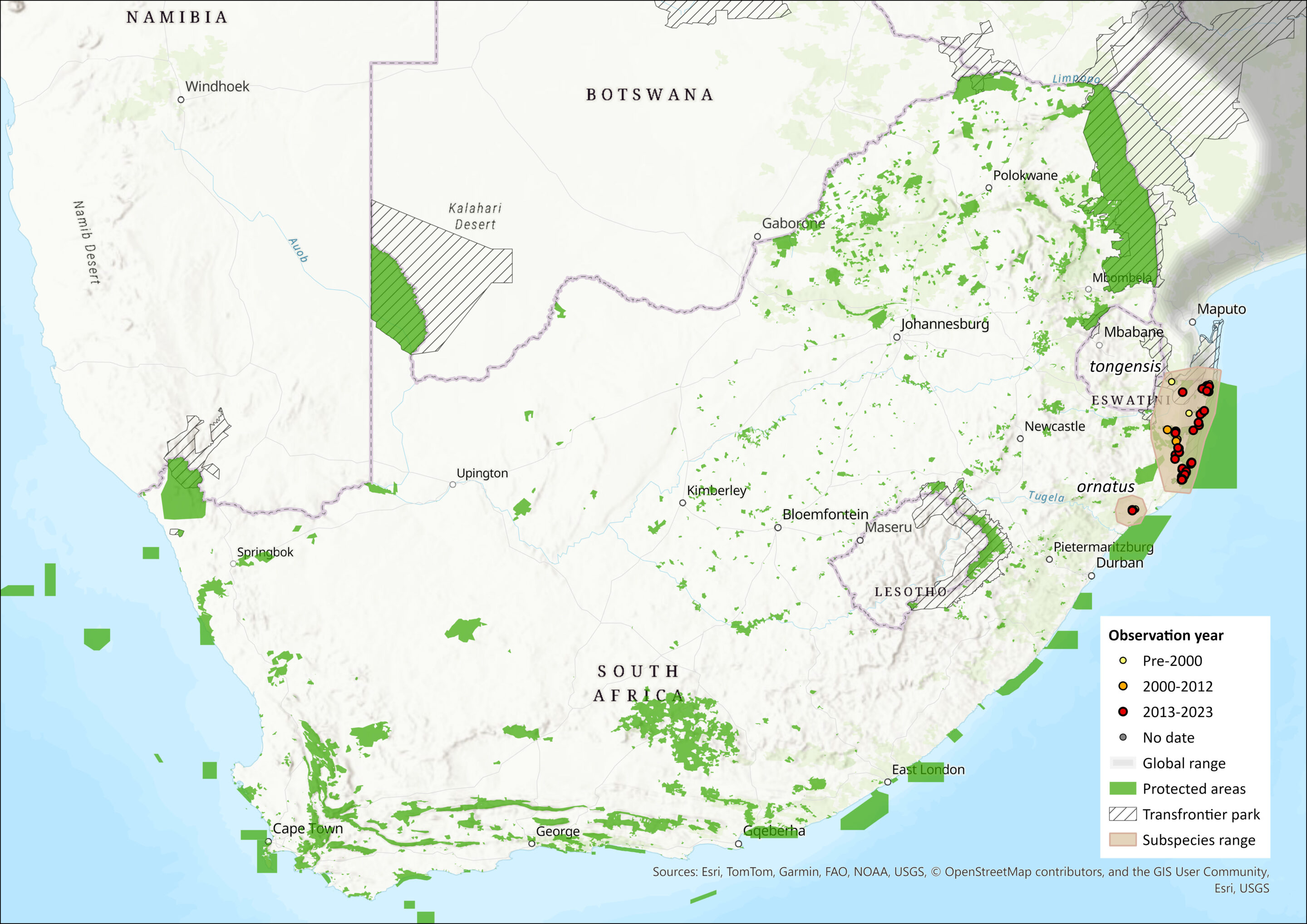 Interventions for this species include protected area expansion to connect forest fragments and enforcement on regulation to prevent disturbances and degradation inside existing forests. If P. p. tongensis is proved to be restricted to Maputaland then it will need reassessment. We recommend molecular research to resolve the complicated taxonomy of this potential species complex within the assessment region.