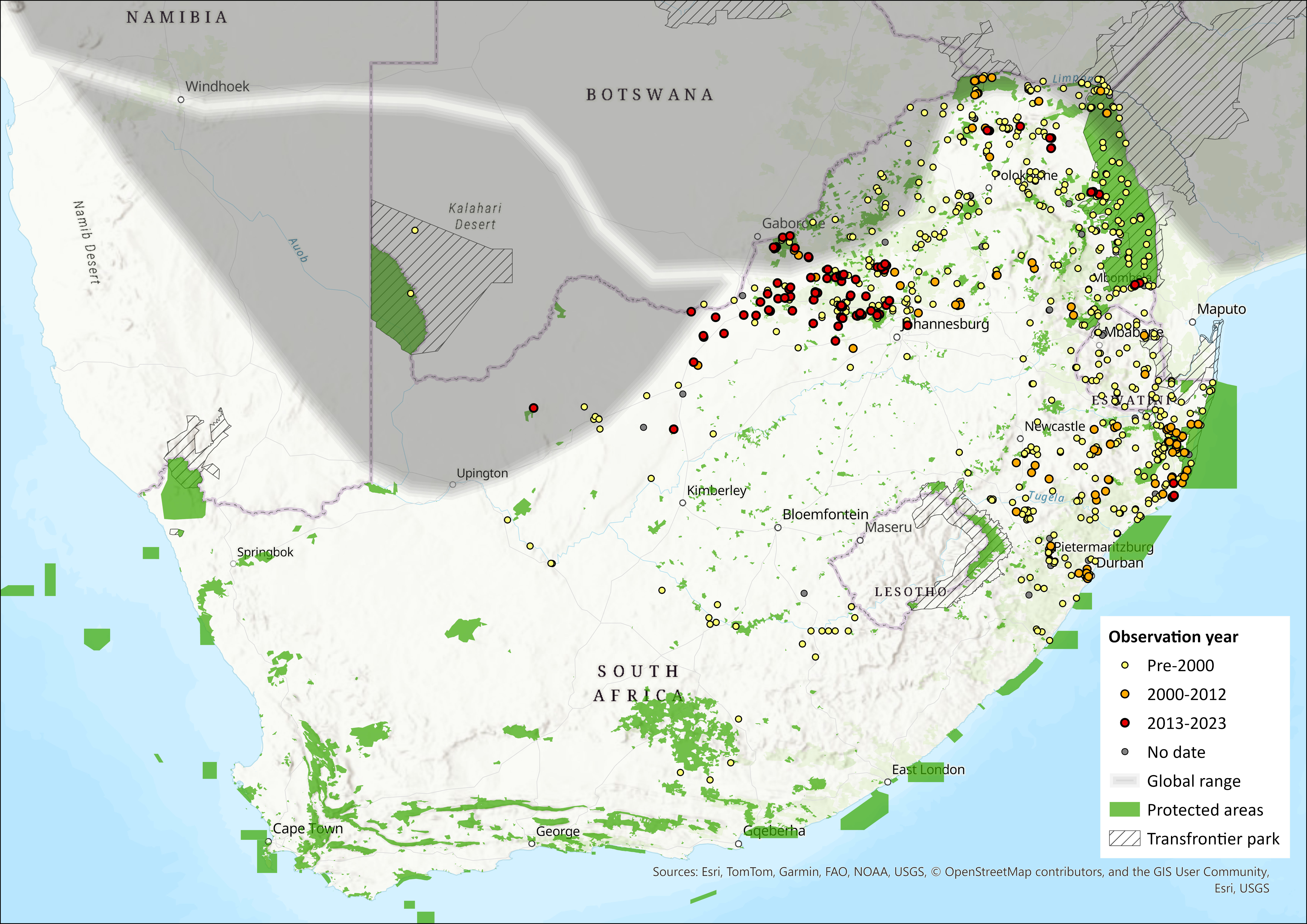 Regional population effects: Dispersal is possible along connected habitats of the northern border of South Africa (Limpopo, North West and Northern Cape Provinces), Namibia, Botswana, Zimbabwe and Mozambique.