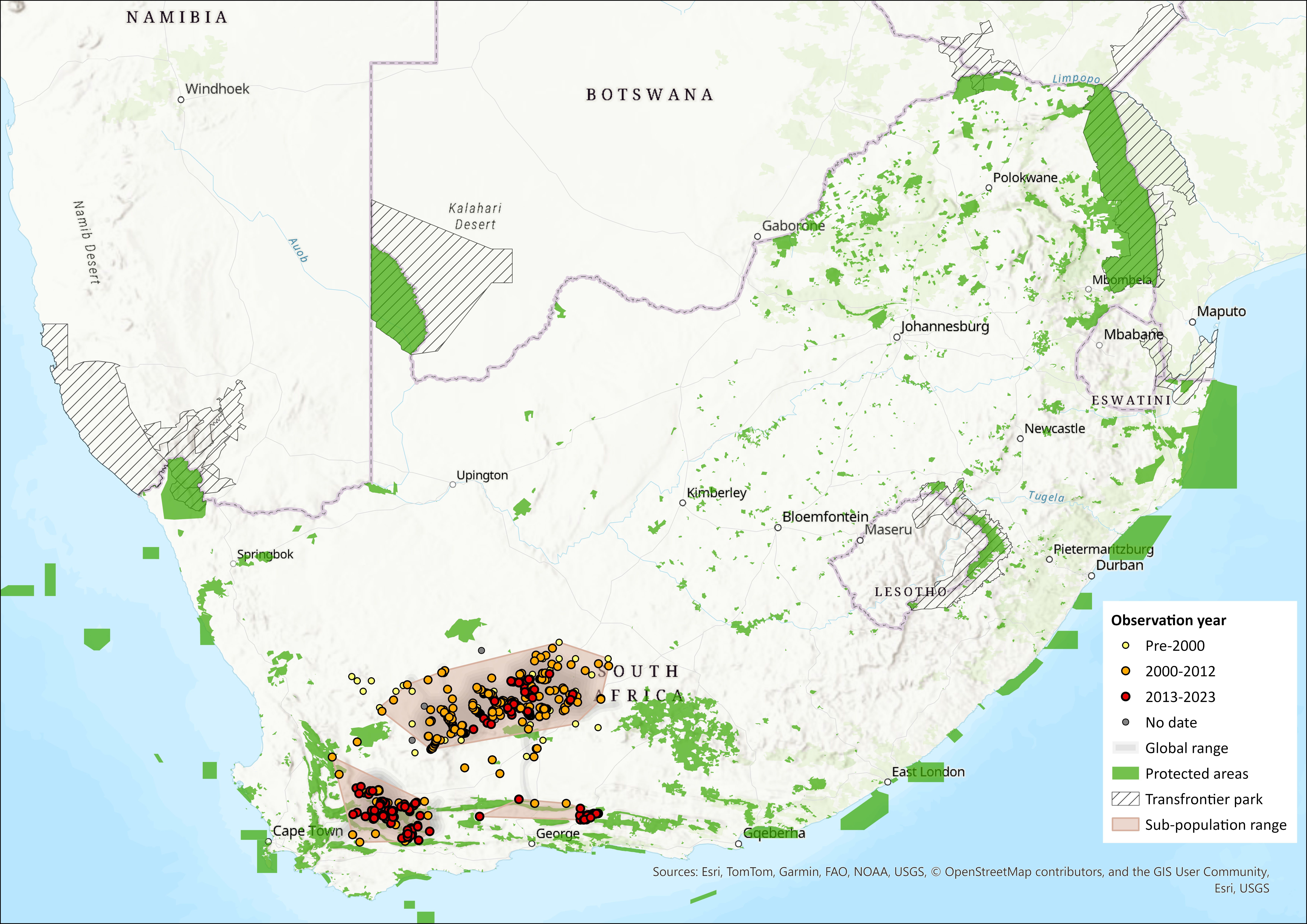 Numerous surveys from 1999-2024 throughout the distribution range have improved estimates of location and sizes of the various subpopulations and facilitated the discovery of and confirmation of the southern- (2003) and eastern subpopulations (2018). Surveys with the Endangered Wildlife Trust’s scent detection dog (Matthew, 2021) and camera traps have confirmed the presences of the species at three historical sites that were predicted to have the species by Duthie et al. (1989) within the northern subpopulation, and new records that extend the previous range estimates.