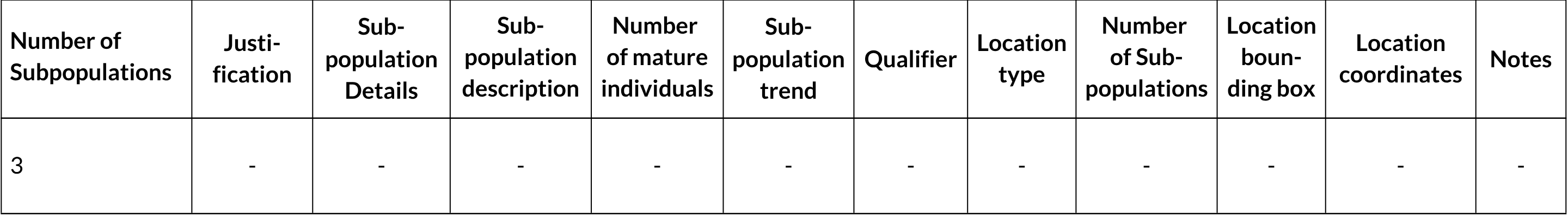 Based on the available information, both of the population genetic indicators adopted into the Kunming-Montreal Biodiversity Framework, can be quantified. Three subpopulations exist and no additional ones are known to have gone extinct; therefore, the proportion of populations maintained within the species receives a score of 1.0 (3/3 population are maintained). The headline indicator, the proportion of populations with an effective population size (Ne) greater than 500, would receive a score between 0.0 and 0.17, to accommodate the uncertainty related to the northern subpopulation and whether it is above or below the Ne 500 threshold (i.e., averaging of 0 [0/3 subpopulations > Ne500] and 0.33 (1/3 subpopulations > Ne 500]).