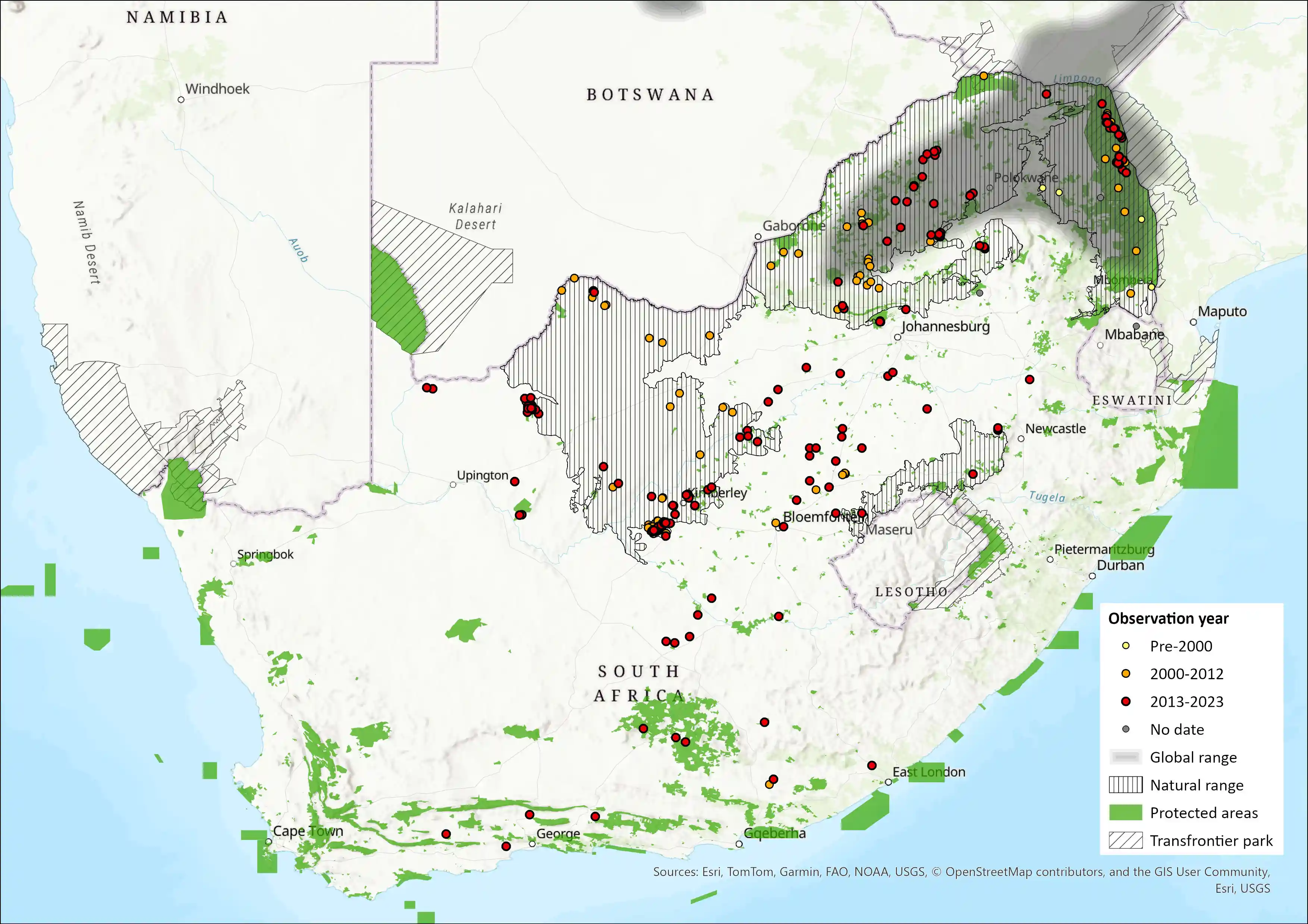 Figure 1. Distribution records for Roan Antelope (Hippotragus equinus) within the assessment region (South Africa, Eswatini and Lesotho). Note that distribution data is obtained from multiple sources and records have not all been individually verified.