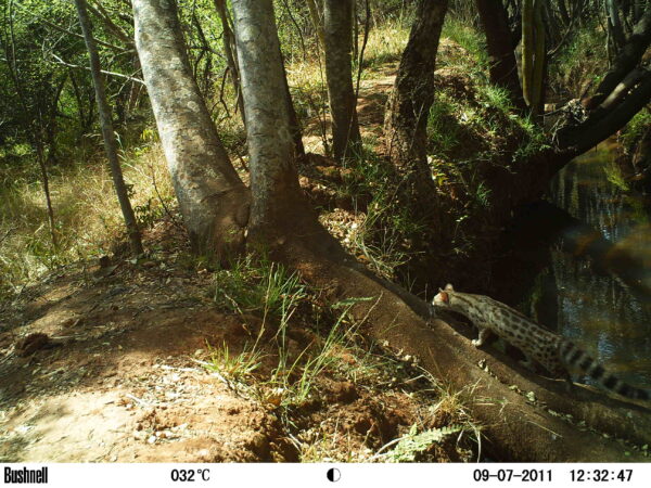 Forssman K, Attwood S. 2023. A record of a melanistic rusty-spotted genet (Genetta maculata) from the White River area, Mpumalanga Province, South Africa. African Journal of Wildlife Research 53(1).