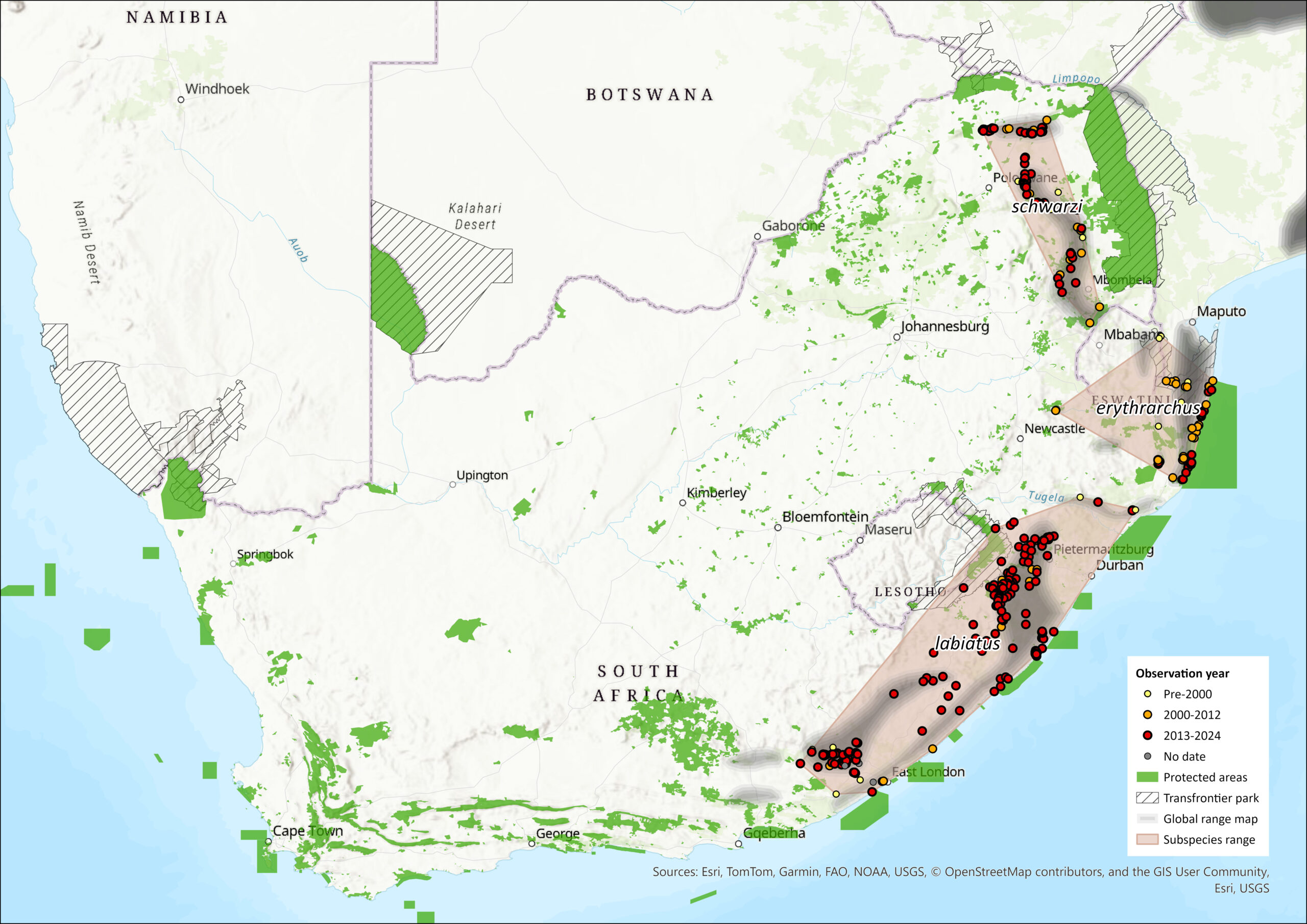 Regional population effects: While C. a. labiatus is confirmed to be endemic to South Africa, and C. a. schwarzi is assumed to be endemic until further research shows otherwise, C. a. erythrarchus is presumably connected to extra-regional subpopulations through the Lubombo Transfrontier Conservation Area and thus we assume rescue effects are possible. Future research should, however, confirm dispersal between countries.