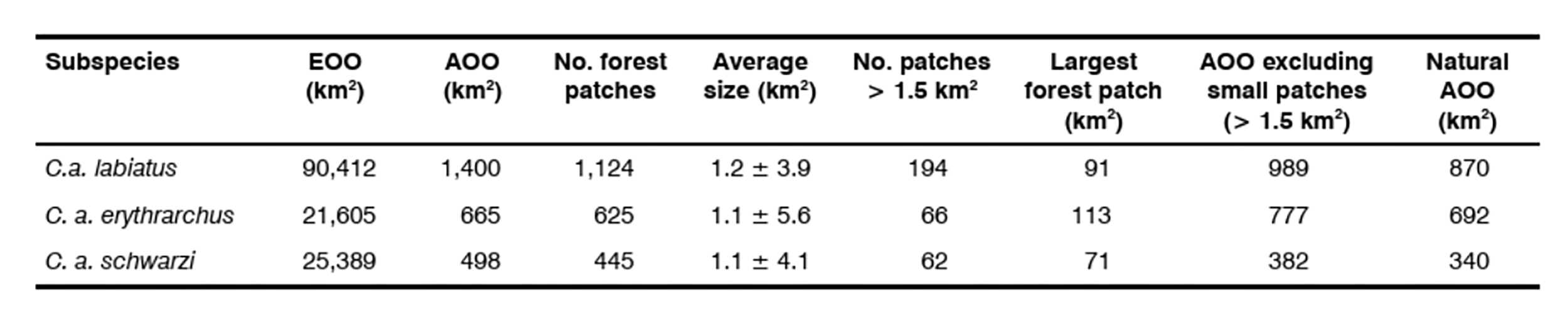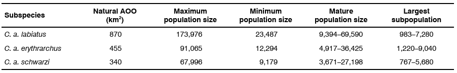 For the subspecies with the largest AOO, C. a. labiatus, Table 3 shows the probable subpopulation sizes in various forest types for currently occupied forest patches above the 1.5 km2 threshold. The analysis still yields over 10,000 mature individuals within the assessment region. However, this approach should be replicated when new density estimates become available for the various forest types within the subspecies’ ranges, especially for the largest forest patches, and when current occupancy of forest patches is more comprehensively mapped.