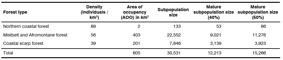 Table 3. Summary of subpopulation size estimates for C. a. labiatus based on observed densities in different forest types for those forest patches above 1.5 km2. Average density per forest type is from Lawes (1992). AOO is area of occupancy.